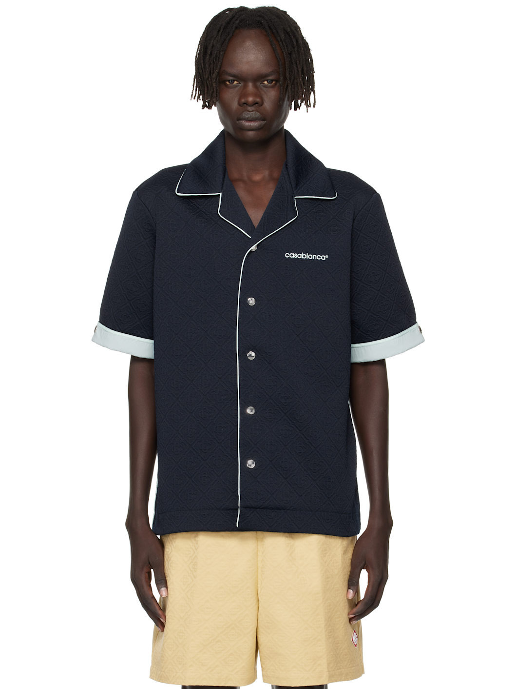 Plain-woven nylon-blend shirt. · Piping and jacquard logo pattern throughout · Open spread collar · Button closure · Logo embroidered at chest · Button fastening at cuffs · Full mesh lining · Logo-engraved silver-tone hardware Supplier color: Navy Body: 65% polyester, 18% polyamide, 17% cotton. Trim: 80% polyester, 20% polyurethane. Lining: 100% polyester. Made in Portugal 252195M192022