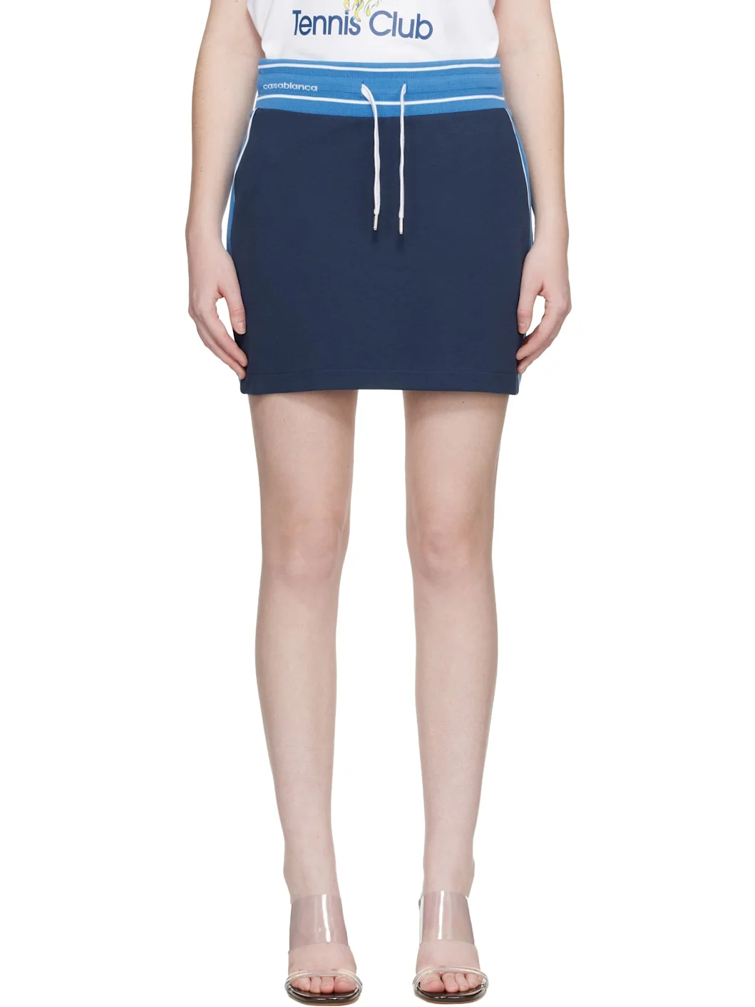 Stretch organic cotton jersey miniskirt. · Drawstring at rib-knit elasticized waistband · Stripes and jacquard logo at waistband · Piping at side seams Supplier color: Navy 98% organic cotton, 2% elastane. Made in Portugal 261195F090000