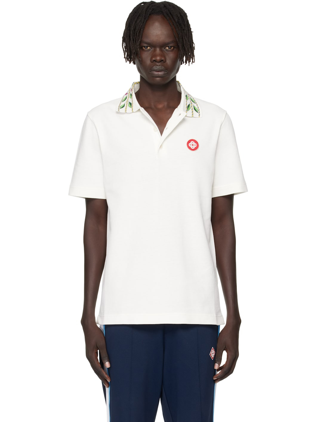 Organic cotton pique polo. · Jacquard graphic at rib-knit spread collar · Three-button placket · Embroidered logo patch at chest · Tennis-tail hem · Logo-engraved hardware Supplier color: Off-white Boyd: 100% organic cotton. Trim: 100% cotton. Made in Portugal 252195M212006