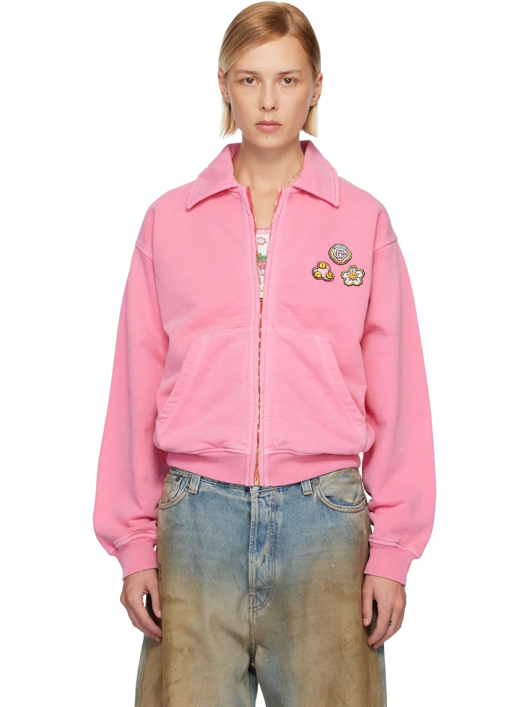 Washed organic cotton French terry jacket. · Spread collar · Zip closure · Embroidered logo appliques at chest · Patch pockets at waist · Rib-knit hem, side panels, and cuffs · Gold-tone hardware Supplier color: Pink Body: 100% organic cotton. Trim 1: 95% cotton, 5% elastane. Trim 2: 95% viscose, 5% ethylene vinyl acetate. Made in Portugal 252195F097003