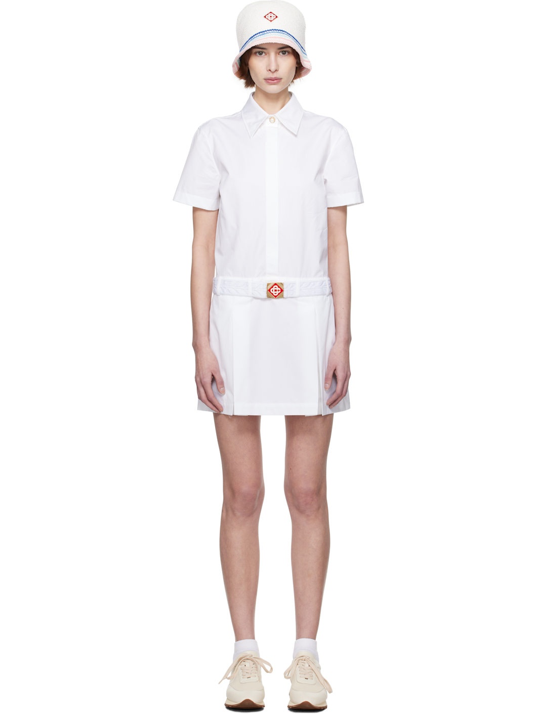 A-line cotton poplin minidress. · Spread collar · Button closure · Belt loops · Detachable elasticized press-release belt · Seam pockets · Twin inverted box pleats at front hem · Concealed zip closure at side seam · Logo-engraved gold-tone hardware Supplier color: White Body: 100% cotton. Trim: 74% polyester, 26% elastodiene. Made in Italy 251195F063003