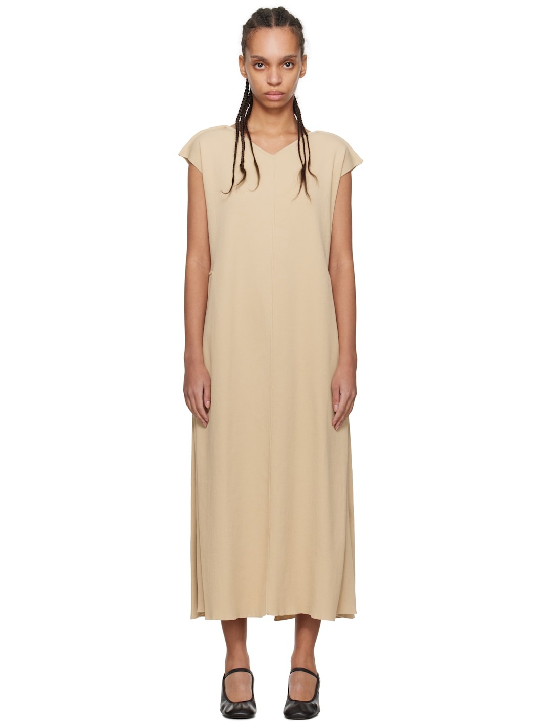 Rib-knit cotton-blend midi dress. Pinched seams throughout. · V-neck · Seam pockets · Dart and inverted pleat at side seams · Central vent at back hem Supplier color: Almond 82% cotton, 18% polyamide. Made in Italy 251007F054004