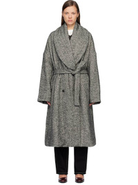 Padded cotton- and wool-blend herringbone coat. · Shawl lapel · Double-breasted button closure · Belt loops at waist · Detachable self-tie belt · Welt pockets · Dropped shoulders · Central vent at back hem · Patch pockets at interior · Full crinkled cotton poplin lining Supplier color: Grey Body: 45% cotton, 25% polyester, 14% polyamide, 8% wool, 5% acrylic, 3% other fibers. Lining: 100% cotton. Made in France 252007F059003