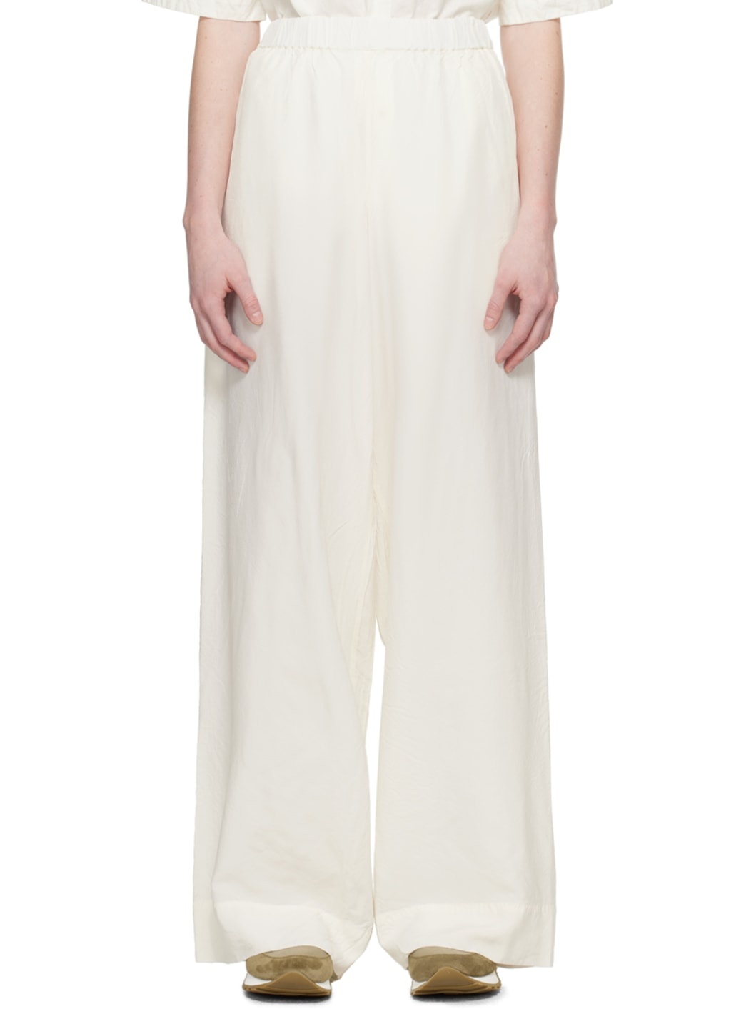 Crinkled viscose- and cupro-blend taffeta trousers. · Concealed drawstring at elasticized waistband · Two-pocket styling · Darts at back waistband Supplier color: Porcelain 57% viscose, 43% cupro. Made in Romania 241007F087013