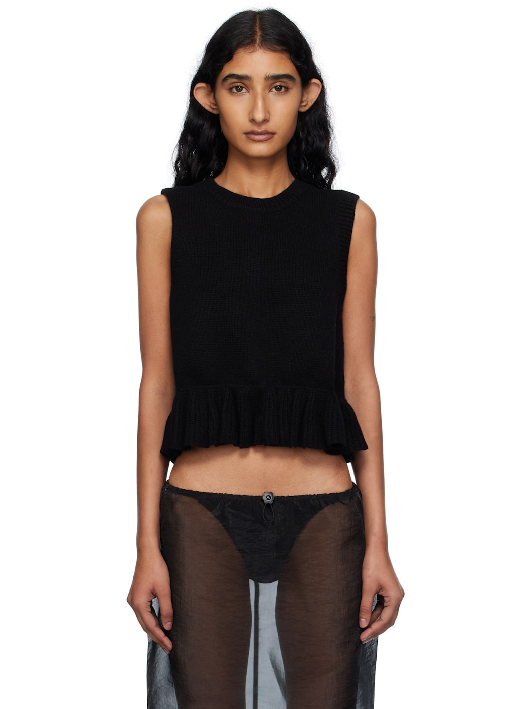Knit recycled cashmere-blend vest. · Rib-knit crewneck, hem, and armscyes · Ruffled peplum hem · Button closure at back Supplier color: Black 97% recycled cashmere, 3% wool. Made in Romania 252002F096003