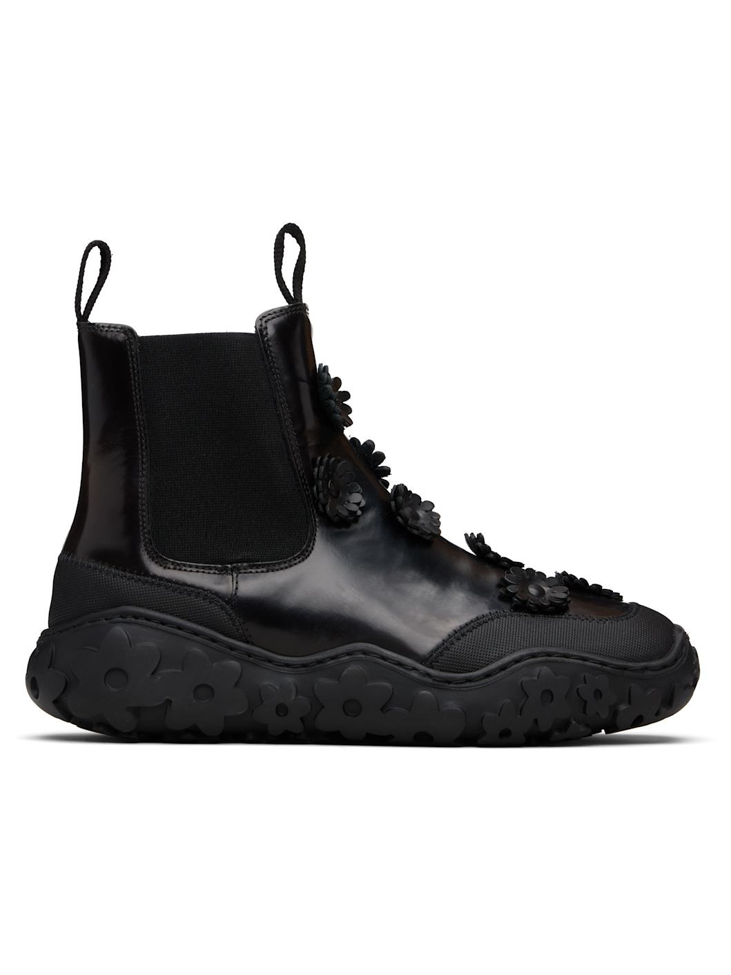 Ankle-high polished leather Chelsea boots. · Certified Positive Luxury Butterfly Mark · Floral appliques at vamp · Elasticized gusset at sides · Pull-loops at collar · Textured rubber trim at welt · Goatskin lining · Treaded rubber sole Supplier color: Black Upper: leather. Sole: thermoplastic rubber. Made in Portugal 252002F113002