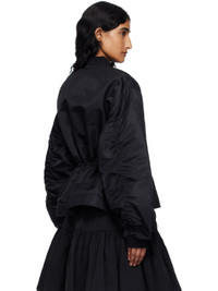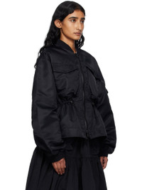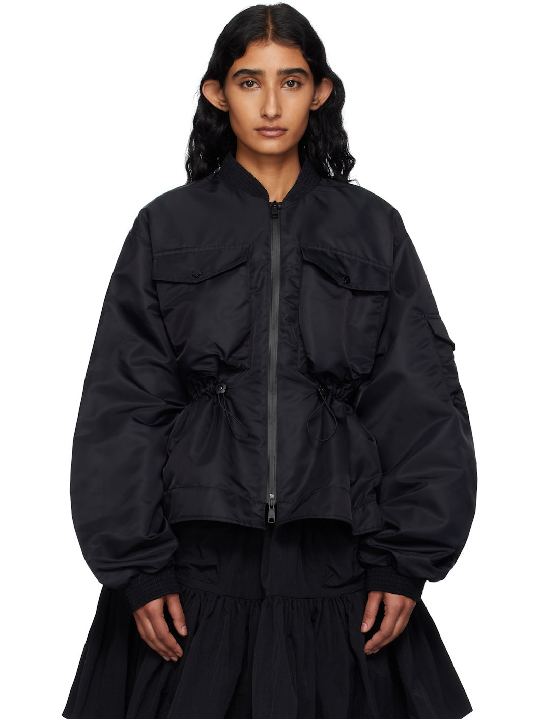 Insulated nylon taffeta bomber jacket. · Shirring at stand collar and cuffs · Two-way zip closure · Flap pockets at front and sleeve · Bungee-style drawstring at waist · Flared hem · Dropped shoulders · Full satin lining Supplier color: Black Body: 100% polyamide. Fill: 100% recycled polyester. Lining: 64% viscose, 36% polyester. Made in Portugal 252002F058000