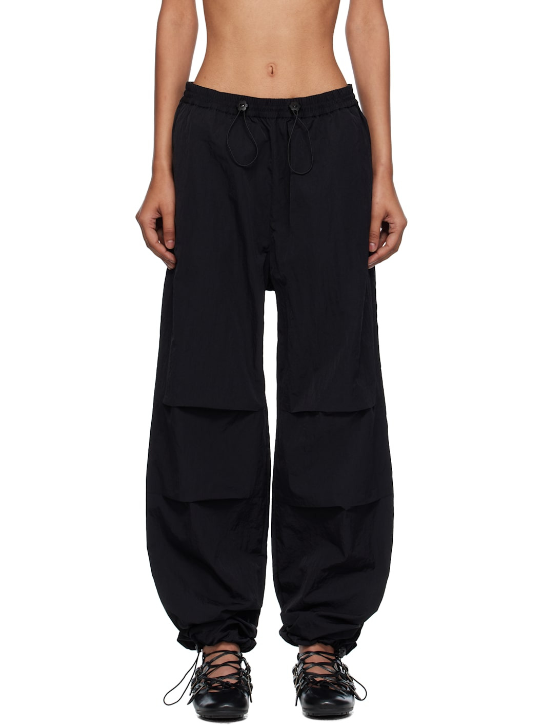 Crinkled recycled nylon taffeta trousers. · Bungee-style drawstring at elasticized waistband · Three-pocket styling · Pleats at knees · Bungee-style drawstring at cuffs Supplier color: Black 100% recycled polyamide. Made in Portugal 252002F087000