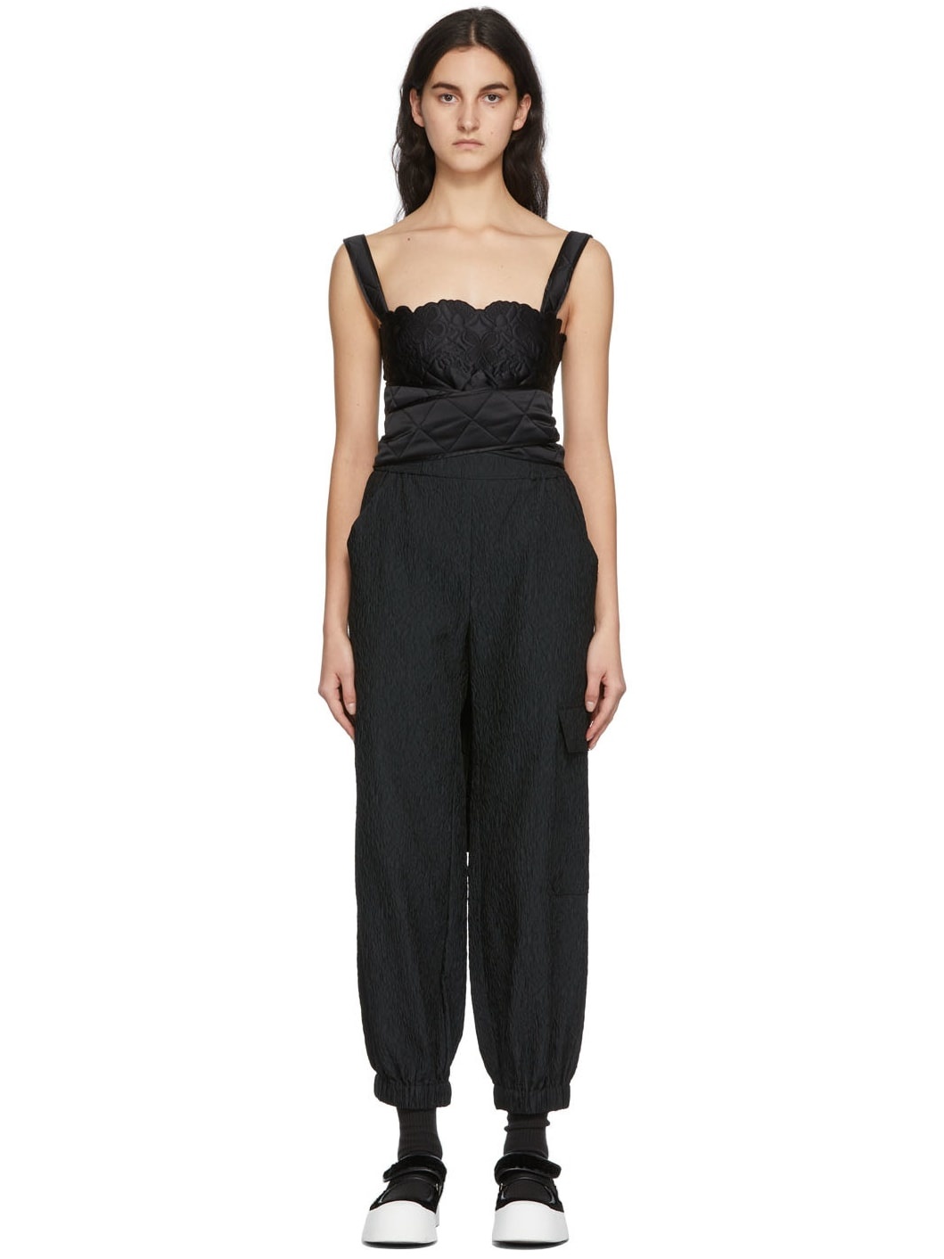 Sleeveless quilted cotton and silk-blend tank top in black. · Tonal floral pattern embroidered throughout · Wrap around self tie fastening at sides Supplier color: Black 54% polyester, 24% silk, 22% cotton. Made in Lithuania 221002F111032