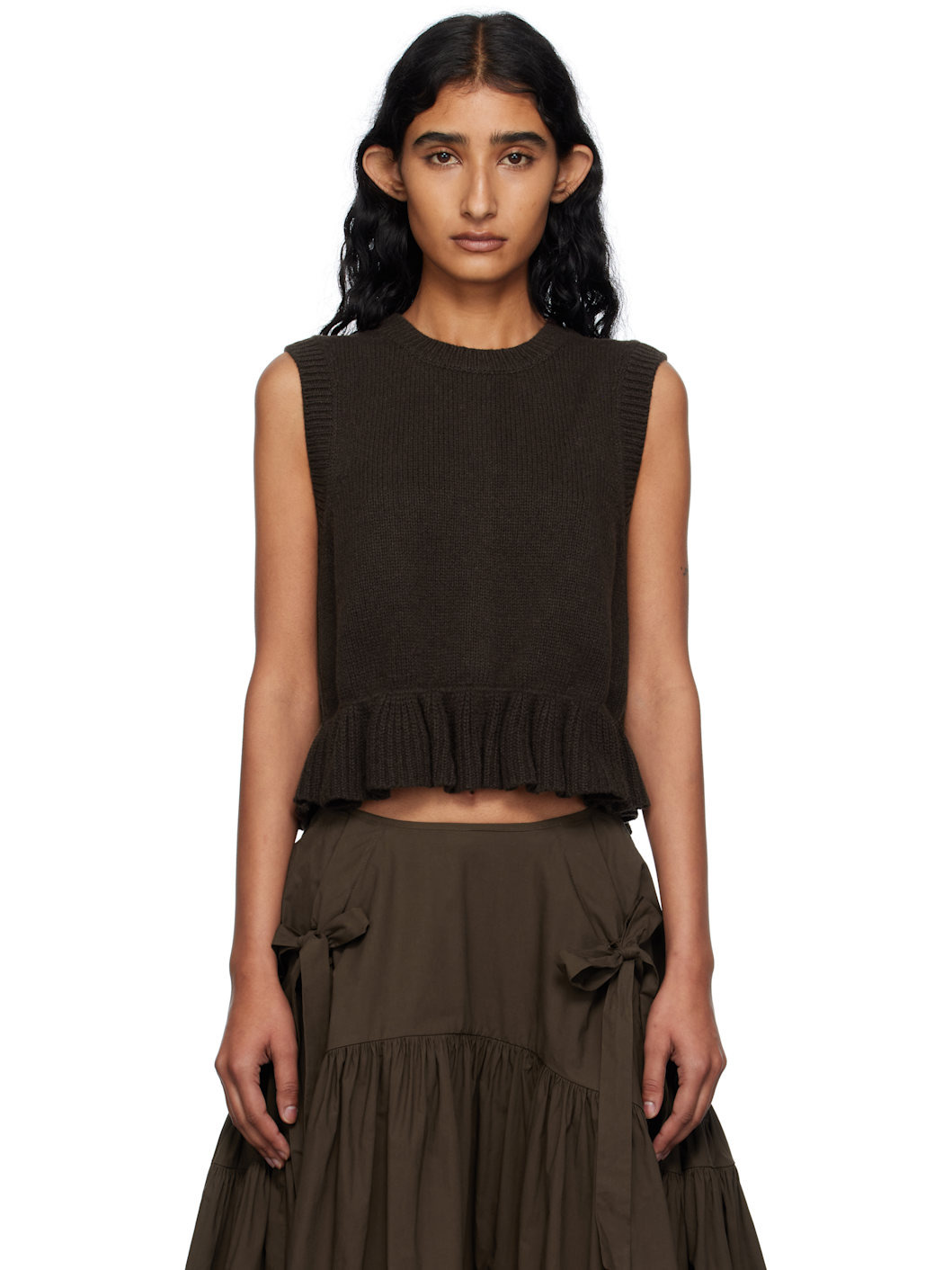 Knit recycled cashmere-blend vest. · Rib-knit crewneck, hem, and armscyes · Ruffled peplum hem · Button closure at back Supplier color: Brown 97% recycled cashmere, 3% wool. Made in Romania 252002F096001