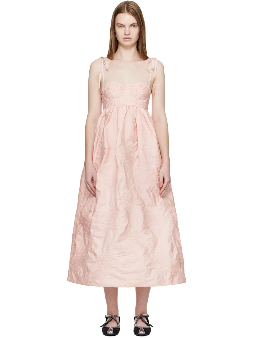 Matelasse midi dress. · Positive Luxury Butterfly Mark-certified · Gathering and jacquard floral pattern throughout · Sweetheart neck · Boning at cups · Self-tie spaghetti straps · Zip closure at back · Partial satin lining Supplier color: Blush pink Body: 72% polyester, 28% acrylic. Lining: 53% cupro, 47% polyester. Made in Latvia 261002F054005