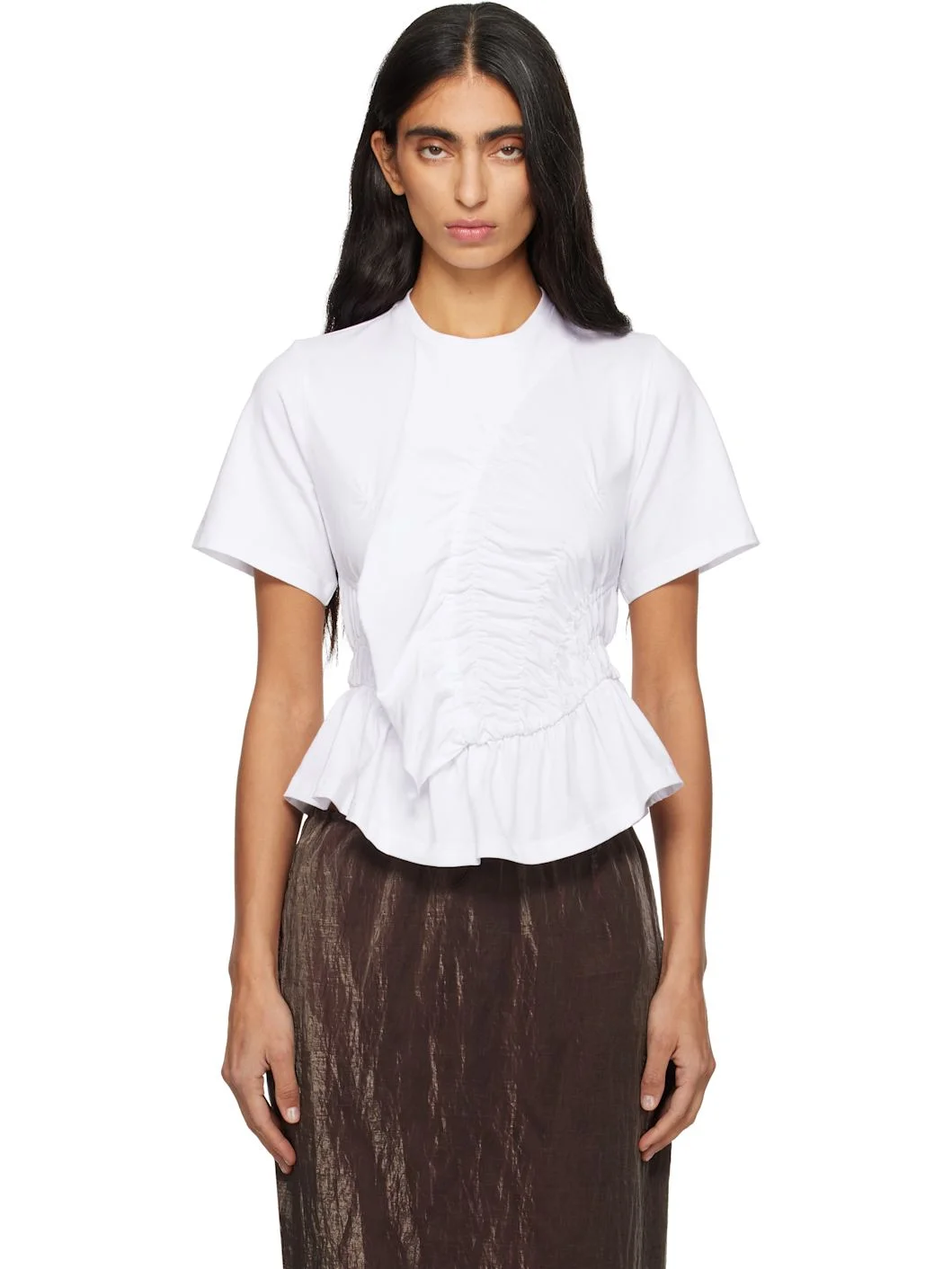 Stretch cotton jersey T-shirt. · Ruching throughout · Rib-knit crewneck · Ruffled trim at front · Peplum hem Supplier color: White 90% cotton, 10% elastane. Made in Portugal 252002F110002