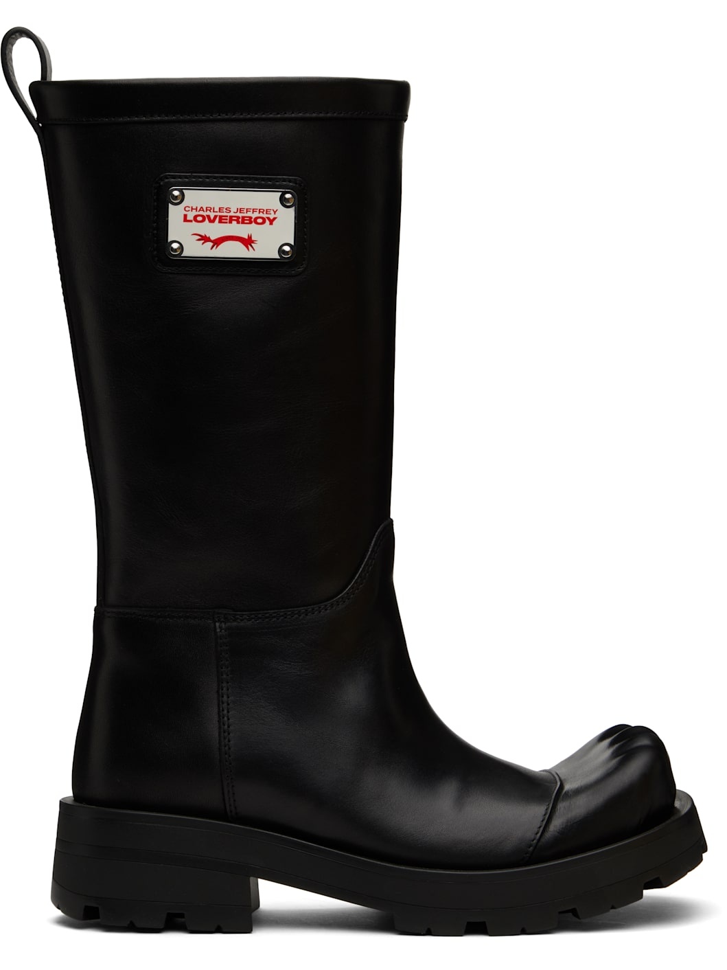 Mid-calf buffed leather boots in black. · Molded square toe · Logo plaque at outer side · Pull-loop at heel collar · Stacked rubber heel · Treaded rubber sole · Heel: H1.75" Supplier color: Black