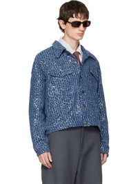 Sequinned non-stretch denim jacket. · Distressing throughout · Spread collar · Button closure · Flap pockets at chest · Welt pockets at waist · Logo flag at front · Buttoned barrel cuffs · Logo patch at back collar · Adjustable button tabs at back hem · Full poplin lining · Logo-engraved gunmetal-tone hardware Supplier color: Blue Body: 100% cotton. Lining: 100% polyester. Made in Portugal 252101M177001