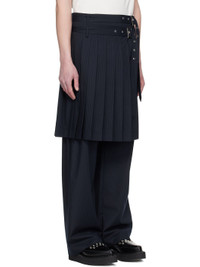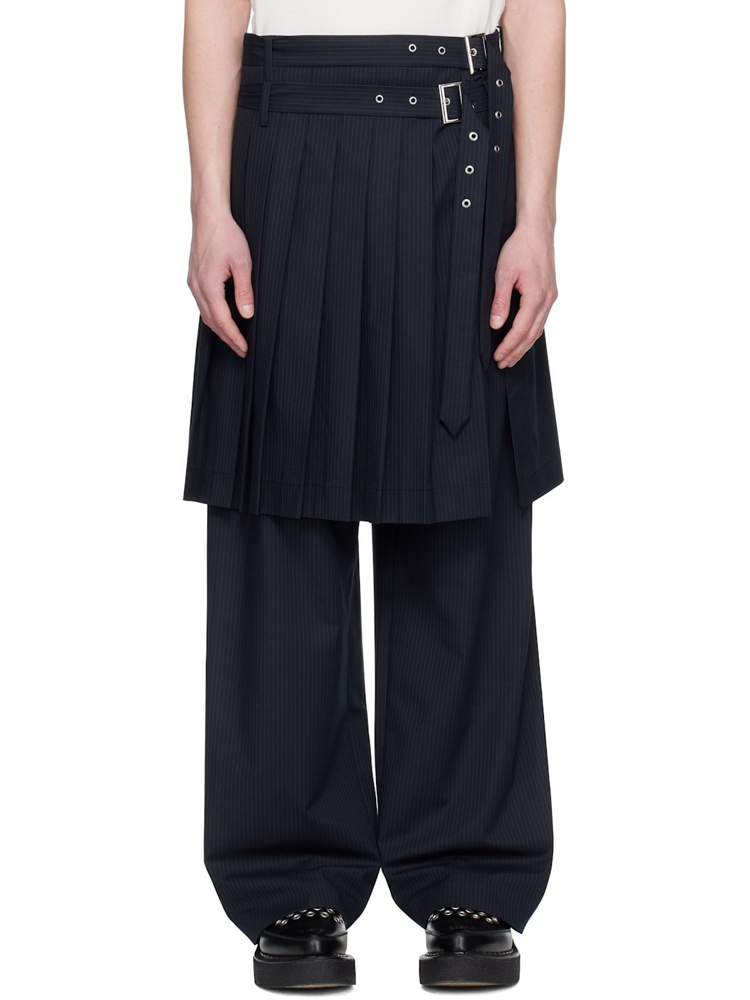 Wide-leg stretch recycled polyester-blend twill trousers. Pinstripes throughout. · Layered construction · Belt loops and detachable pin-buckle belts · Two-pocket styling · Zip fly · Pleats and vent at skirt-style overlay Supplier color: Navy pinstripe 64% recycled polyester, 33% viscose, 3% elastane. Made in Bulgaria 251101M191000