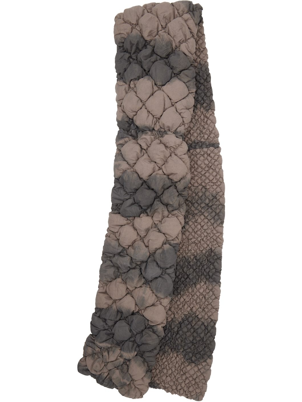 Shirred satin scarf in taupe. · Down-filled and mineral-dyed · Logo patch at end · L64" x W6" Available exclusively at SSENSE. Supplier color: Dark brown/Light brown Fill: 90% down, 10% feather. Body: 100% nylon. Made in Portugal 251785M150000