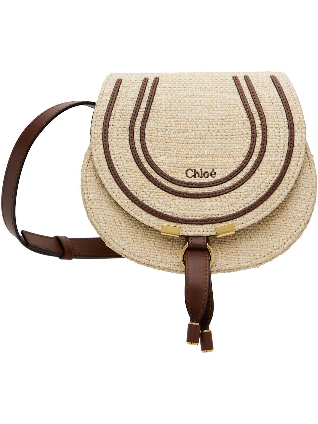 Woven faux-raffia shoulder bag in beige. · Buffed calfskin trim throughout · Adjustable crossbody strap · Logo embroidered at face · Concealed patch pocket at face · Tab-slot foldover flap · Card slot at interior · Suede lining · H7" x W7.5" x D4" Supplier color: Hot sand Textile, calfskin. Made in Italy 251338F048040