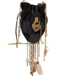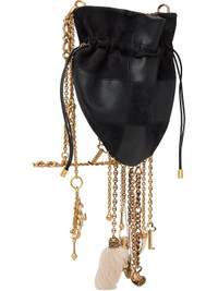 Patchworked grained buffalo leather and goatskin suede shoulder bag. · LWG-certified leather · Adjustable cable chain crossbody strap · Detachable chains with logo charms at strap · Padlock and key at face · Chain tassels with charms at base · Drawstring closure · Grained lambskin lining · H10" x W9.5" Supplier color: Black Buffalo leather, goatskin. Made in Italy 252338F048017