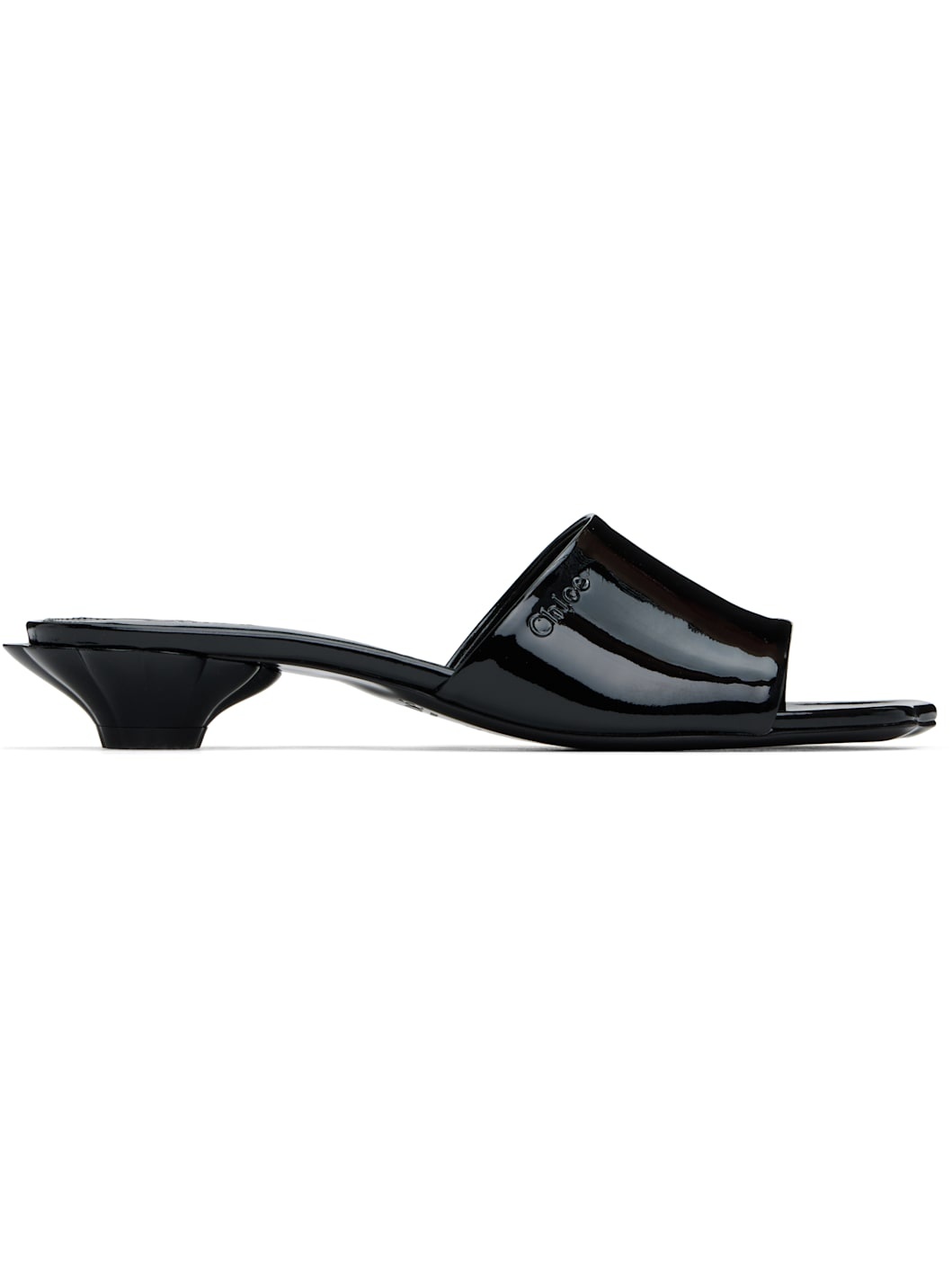 Patent calfskin slip-on flat sandals in black. · LWG-certified · Open square toe · Logo embossed at vamp · Logo embossed at goatskin footbed · Sculptural kitten heel with rubber injection · Polished leather sole · Heel: H1.5" Supplier color: Black Upper: calfskin. Sole: leather. Made in Italy 251338F124015