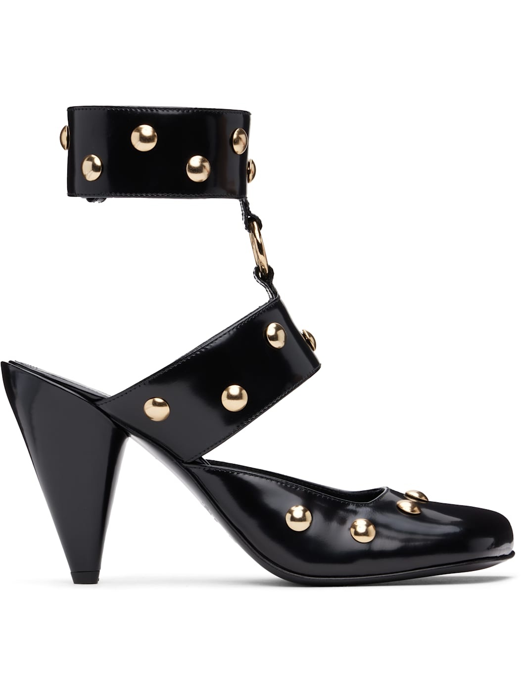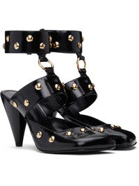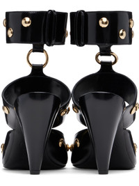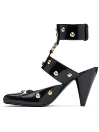 LWG-certified polished calfskin heels in black. · Studs throughout · Square toe · O-ring at vamp · Adjustable press-stud ankle strap · Logo printed at padded goatskin insole · Buffed goatskin lining · Covered cone heel with rubber injection · Polished leather sole · Heel: H3.75" Supplier color: Black Upper: calfskin. Sole: leather. Made in Italy 242338F122003