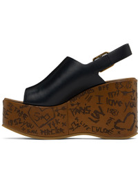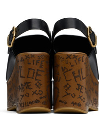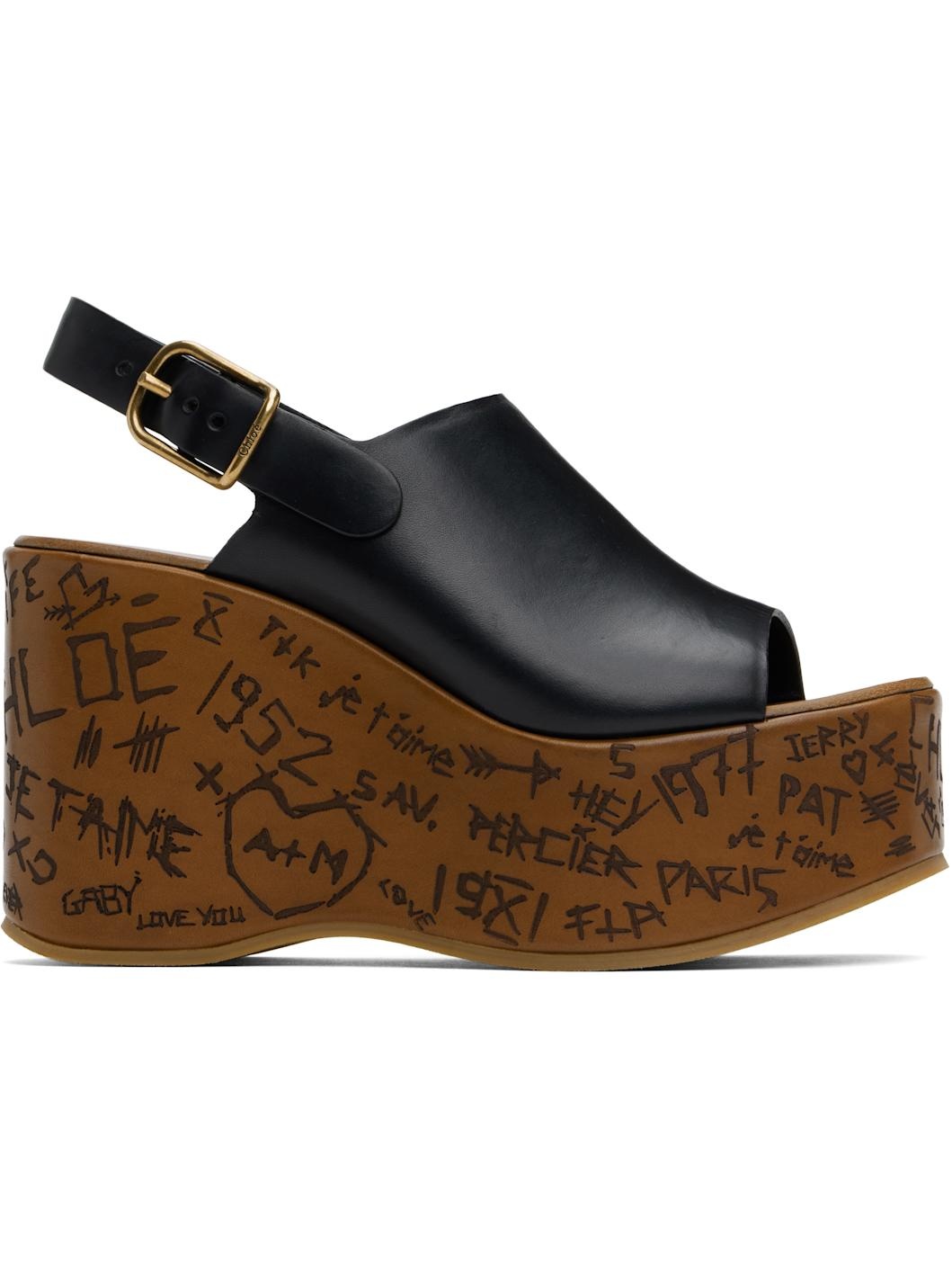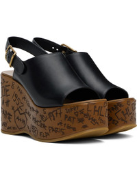 Vegetable-tanned buffed calfskin heeled sandals in black. · LWG-certified · Open toe · Pin-buckle slingback strap · Logo embossed at calfskin footbed · Text etched at covered platform midsole and wedge heel · Crepe rubber sole · Logo-engraved antiqued gold-tone hardware · Platform: H2" · Heel: H4" Supplier color: Black Upper: calfskin. Sole: rubber. Made in Italy 251338F125001