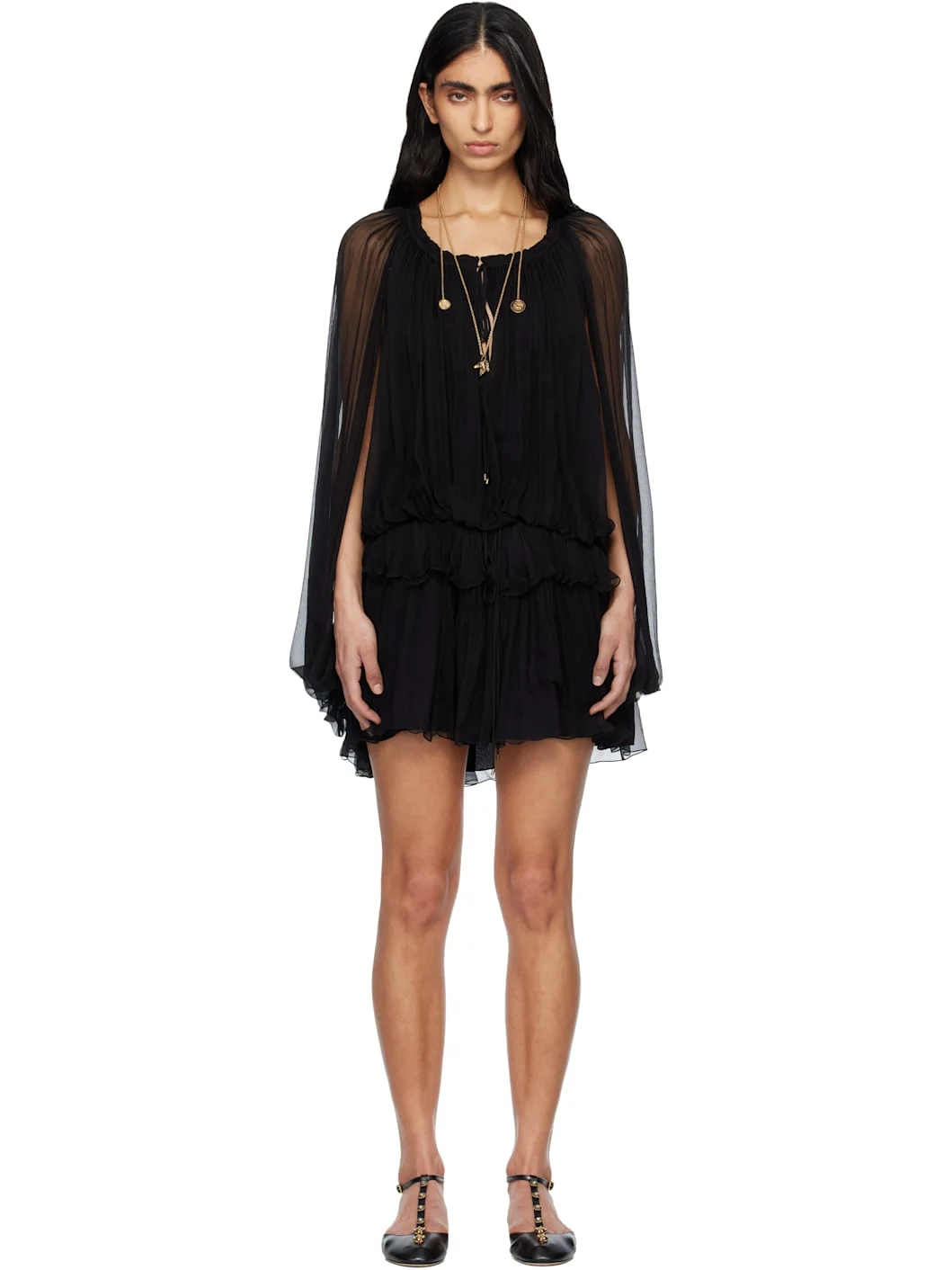 Silk mousseline minidress. · Gathering and draping throughout · Drawstring at round neck and waist · Keyhole at chest · Tiered ruffled hem · Integrated cape · Fully lined Supplier color: Black Body: 100% silk. Lining: 90% acetate fiber, 10% silk. Made in Madagascar 261338F052001