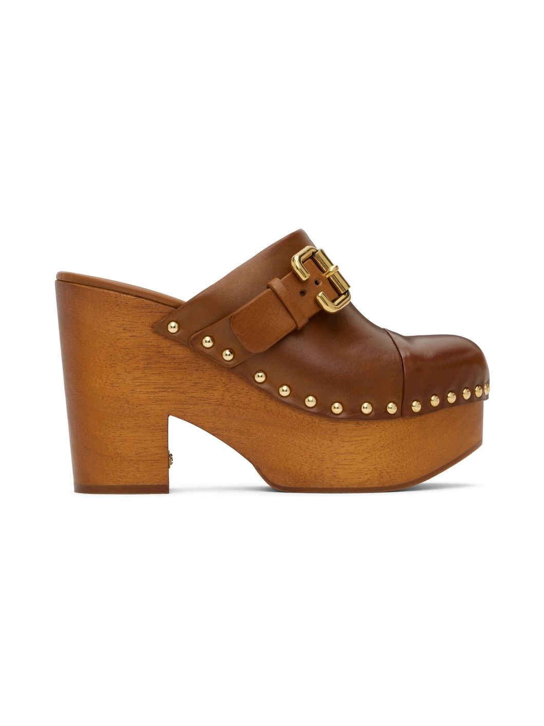 Buffed leather slip-on clogs in brown. · Pin-buckle strap at vamp · Buffed calfskin lining · Logo embossed at padded calfskin footbed · Studs at welt · African paduak wood block heel · Logo plaque at heel · African padauk wood platform midsole · Textured PU sole · Platform: H2" · Heel: H4.5" Supplier color: Ginger brown Upper: leather. Sole: african paduak wood, thermoplastic polyurethane. Made in Italy 242338F121002
