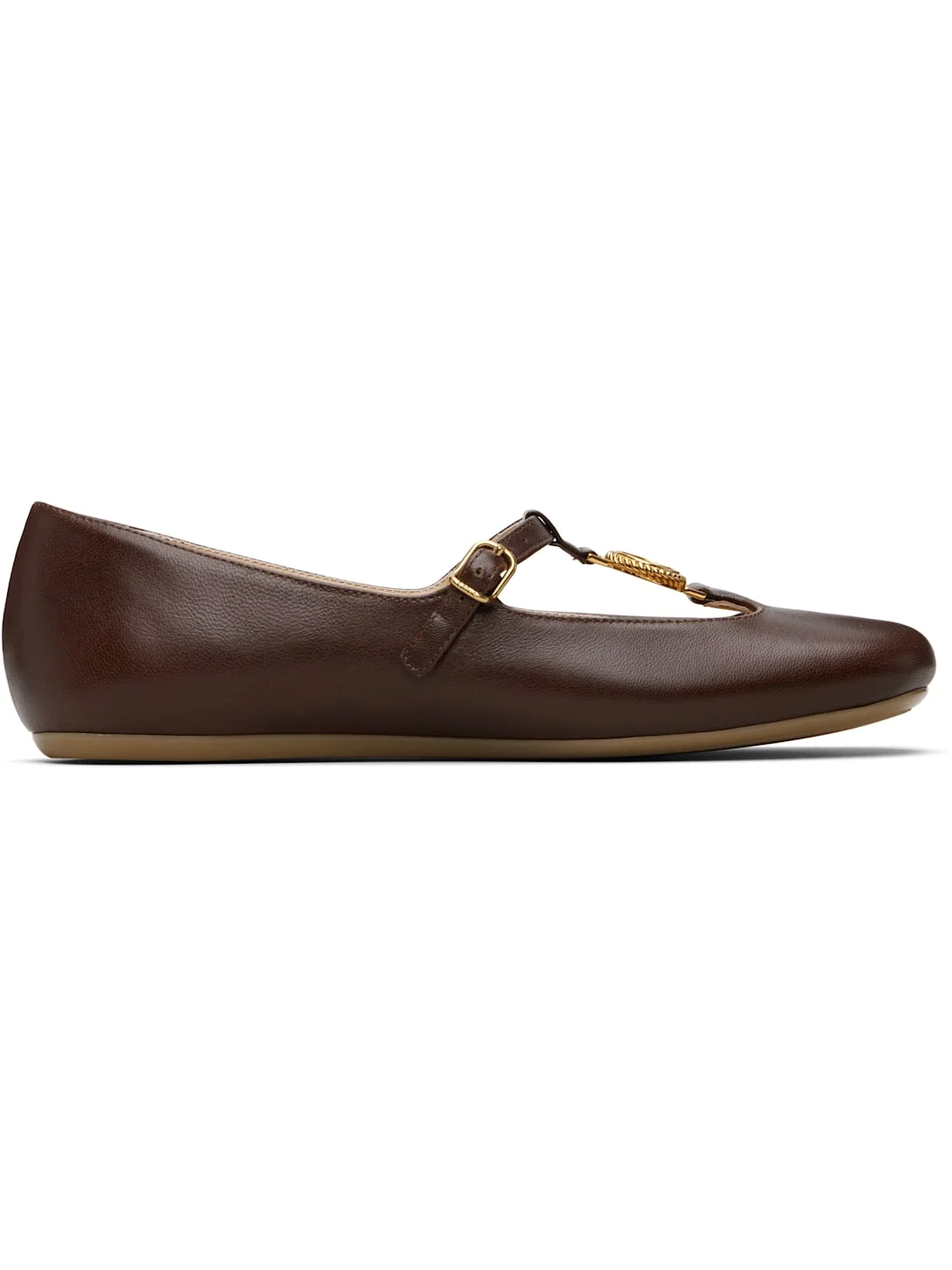Grained lambskin Mary Jane-style ballerina flats. · LWG-certified lambskin · Pin-buckle T-strap with logo hardware at vamp · Buffed lambskin lining · Rubber sole Supplier color: Chocolate Brown Upper: lambskin. Sole: rubber. Made in Italy 252338F118000
