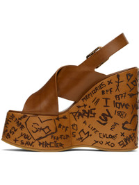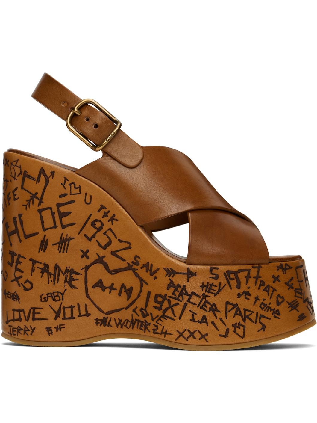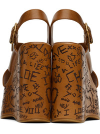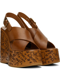 LWG-certified buffed leather heeled sandals in brown. · Open toe · Crisscrossing straps at vamp · Pin-buckle slingback strap · Logo-embossed buffed calfskin footbed · Text engraved at covered platform midsole and wedge heel · Crepe rubber sole · Logo-engraved antiqued brass-tone hardware · Platform: H2.25" · Heel: H5" Supplier color: Ginger brown Upper: leather. Sole: thermoplastic polyurethane. Made in Italy 251338F122000