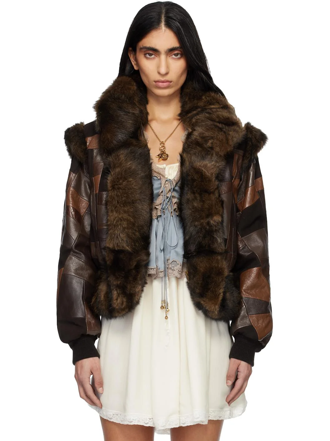 Patchworked lambskin, sheepskin, and goatskin bomber jacket. · LWG-certified leathers · Shearling trim throughout · Shawl collar · Zip closure · Zip pockets at waist · Rib-knit cuffs · Welt pocket at interior · Satin lining Supplier color: Faraway Brown Body 1: 100% lambskin. Body 2: 100% sheepskin. Body 3: 100% goatskin. Fill: 60% polyethylene, 40% polyester. Trim: 93% virgin wool, 5% polyamide, 2% elastane. Lining: 100% cupro. Made in Italy 252338F062003