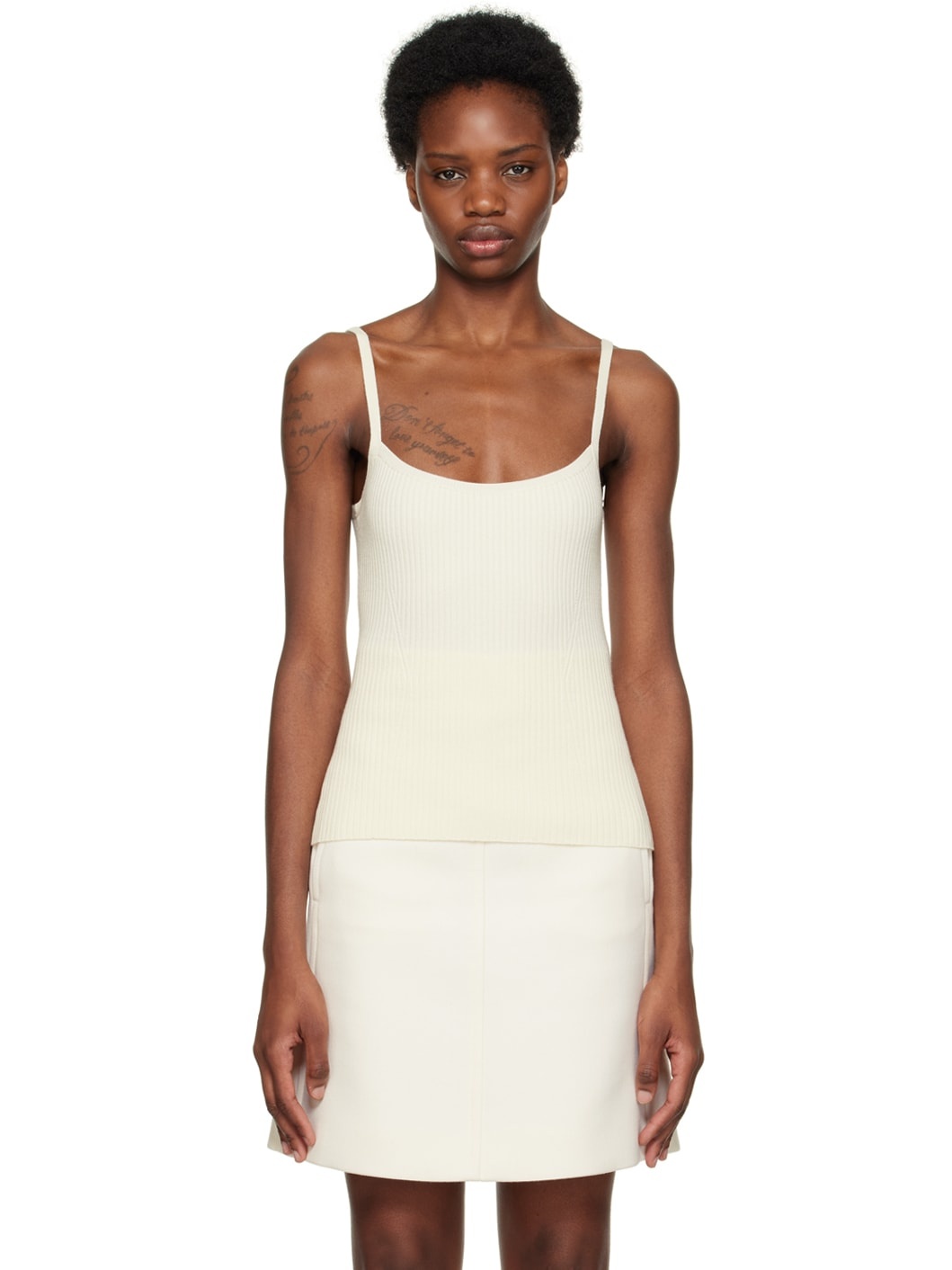 Rib knit stretch wool and cashmere-blend camisole. · Scoop neck · Darts at front and back · Spaghetti straps Supplier color: Lovely white 83% wool, 9% cashmere, 7% polyamide, 1% elastane. Made in Italy 231338F111004