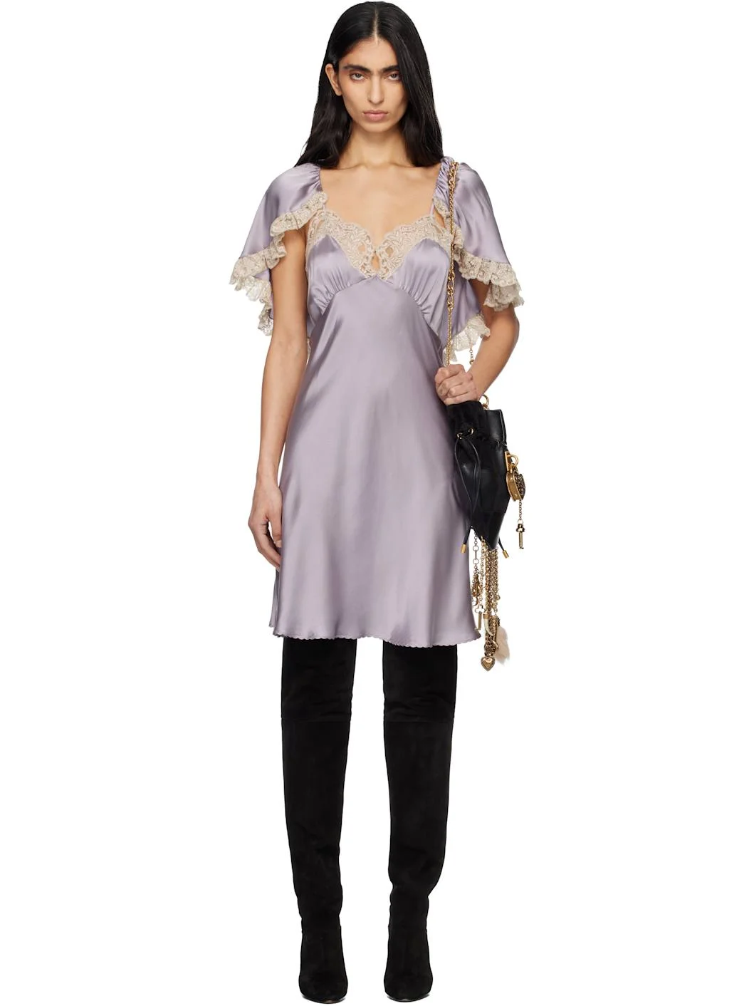 Silk satin minidress. · Scalloped lace trim throughout · Sweetheart neck · Buttoned keyhole at chest and integrated cape · Scalloped hem · Fixed spaghetti straps · Mother-of-pearl hardware Supplier color: Smoky Purple Body: 100% silk. Trim 1: 88% polyester, 9% viscose, 3% polyamide. Trim 2: 91% polyester, 7% viscose, 2% polyamide. Made in Italy 252338F052004