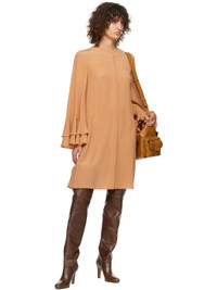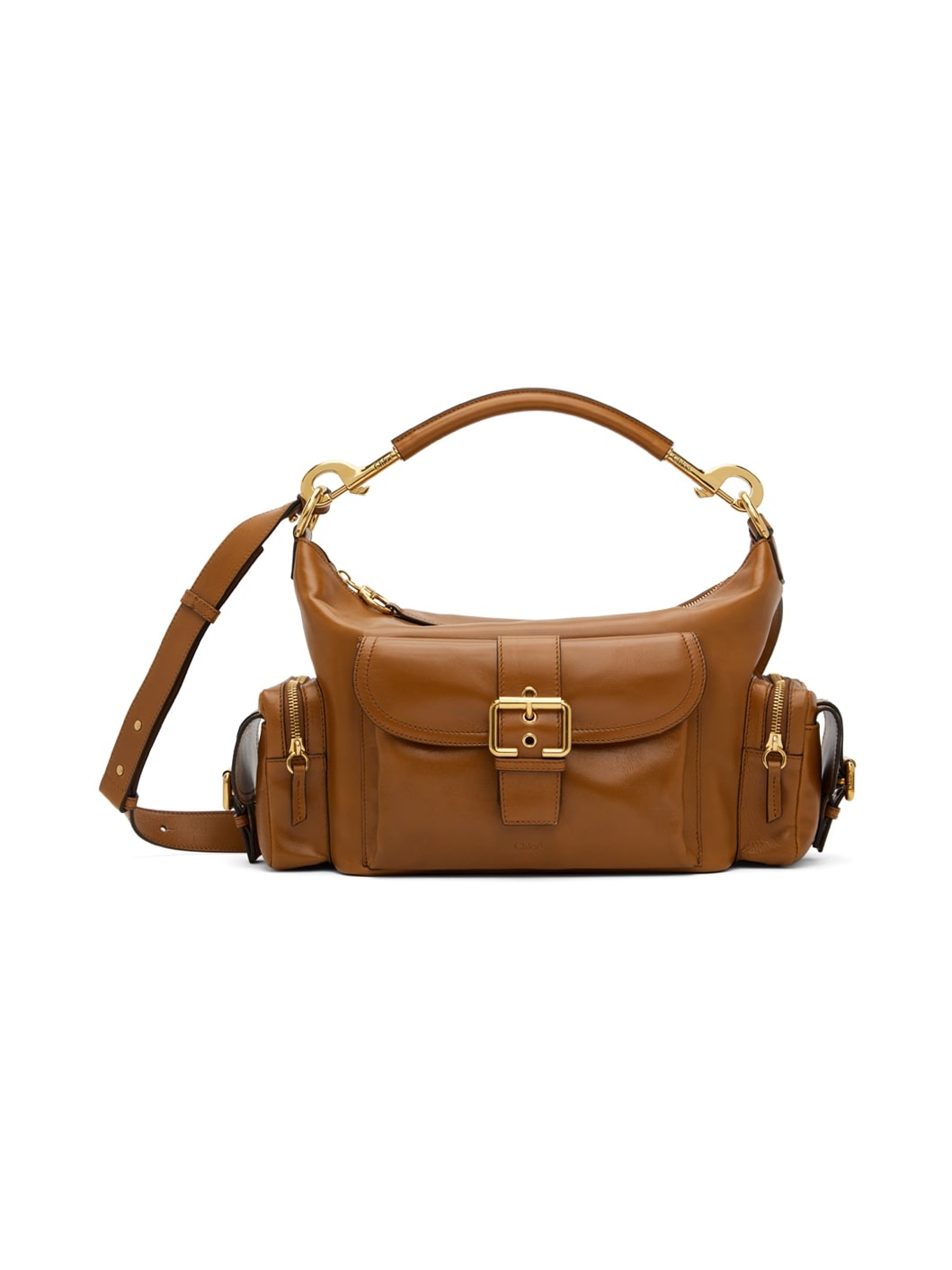 LWG-certified buffed leather shoulder bag in tan. · Detachable shoulder strap · Detachable and adjustable post-stud crossbody strap · Logo embossed at face · Flap pocket at face · Zip and flap pocket at sides · Zip closure · Canvas lining · Logo-engraved gold-tone hardware · H9" x W14" x D5.5" Supplier color: Clay brown Leather. Made in Italy 242338F048038