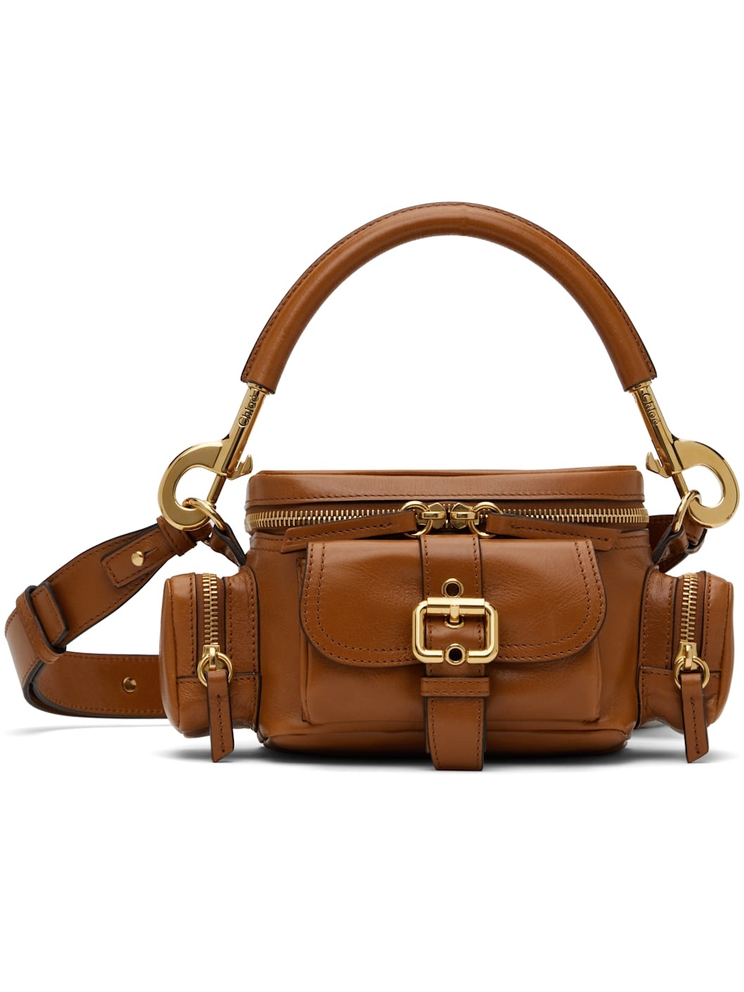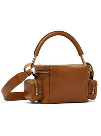 LWG-certified grained buffalo leather shoulder bag in tan. · Detachable rolled carry handle · Detachable and adjustable post-stud crossbody strap · Pin-buckle flap pocket at face · Zip pocket at sides · Two-way zip closure · Patch pocket at interior · Cotton- and linen-blend canvas lining · Logo-engraved gold-tone hardware · H5" x W7.5" x D4" Supplier color: Clay brown Body: 100% buffalo leather. Lining: 54% cotton, 46% linen. Made in Italy 242338F048037
