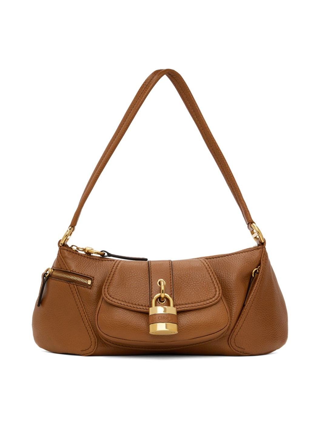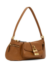 Grained calfskin shoulder bag in tan. · Fixed shoulder strap · Logo embossed at face · Padlock and flap pocket · Zip pocket at sides · Zip closure · Cotton- and linen-blend canvas lining · Logo-engraved gold-tone hardware · H6.5" x W13.5" x D3" Supplier color: Clay brown Calfskin. Made in Italy 242338F048028
