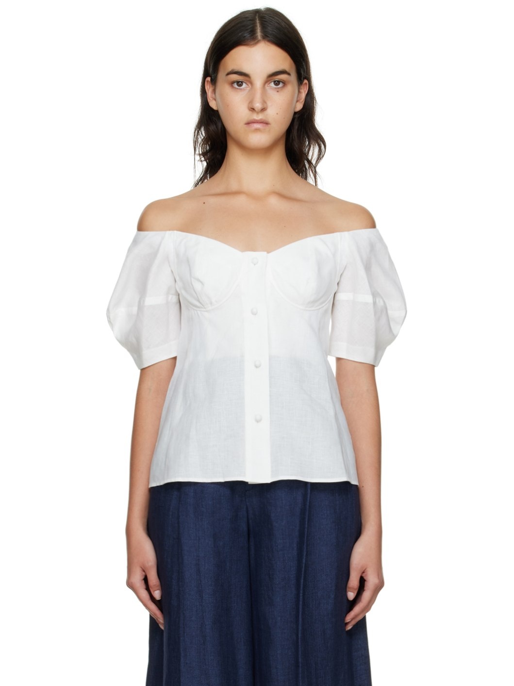 Plain-woven slub linen blouse. · Off-the-shoulder construction · Button closure · Puff sleeves Supplier color: Iconic milk 100% linen. Made in Madagascar 222338F107003