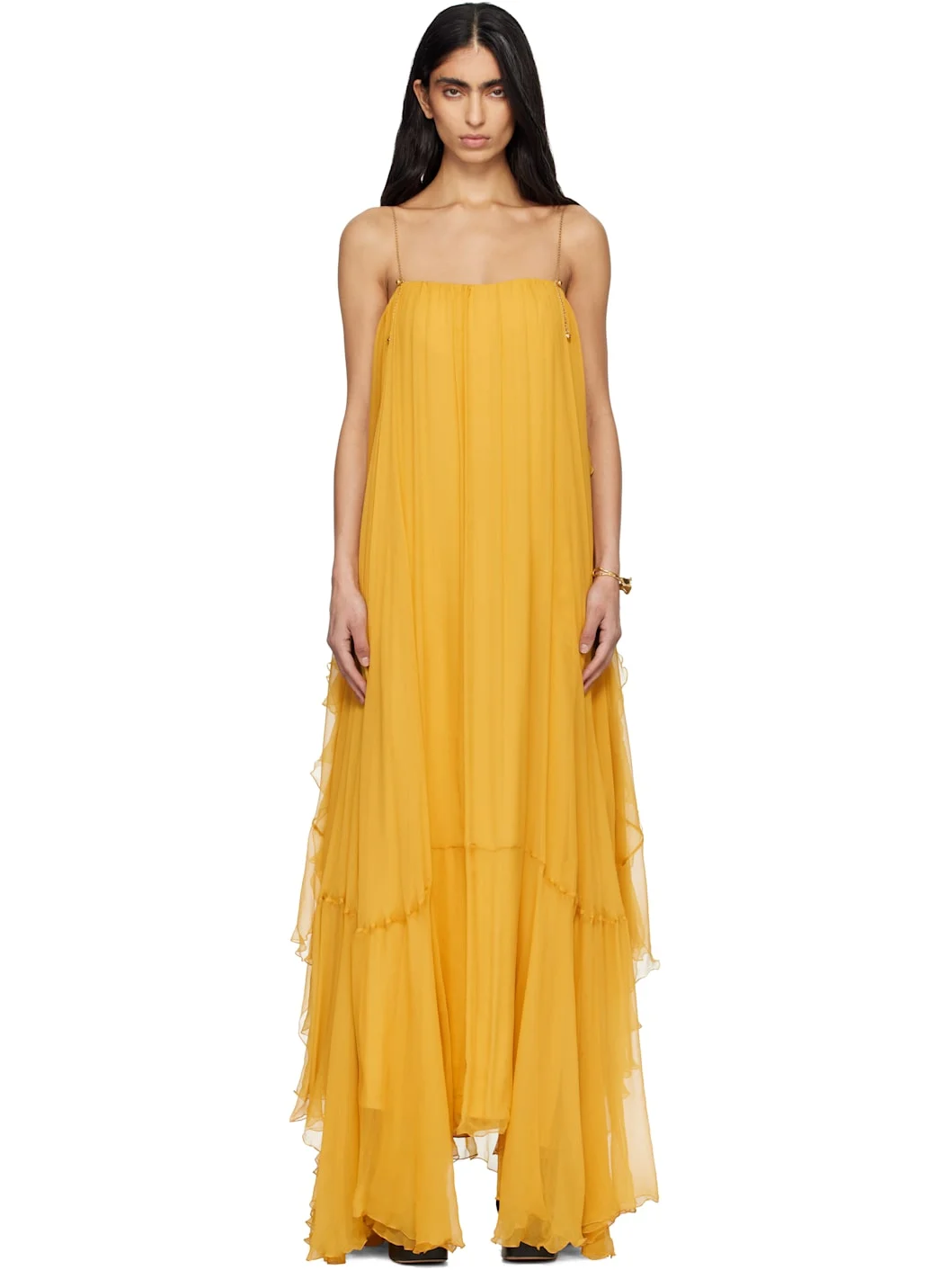 Layered silk mousseline maxi dress. · Gathering, draping, and ruffles throughout · Square neck · Fixed curb-chain shoulder straps with beads · Handkerchief hem · Seam pockets at sides · Concealed hook-eye fastening at side · Fully lined Supplier color: Mustard Body: 100% silk. Lining: 90% acetate fiber, 10% silk. Made in Madagascar 261338F055001