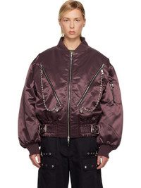 Satin bomber jacket. · Rib-knit stand collar and cuffs · Charms at two-way zip closure · Zip pockets with charms and chain detailing at front · Pin-buckle straps at elasticized hem · Zip pocket and charm at sleeve · Fully lined Supplier color: Brown Body: 100% polyester. Trim: 70% viscose, 30% polyester. Lining: 100% polyester. Made in Bulgaria 252529F058002
