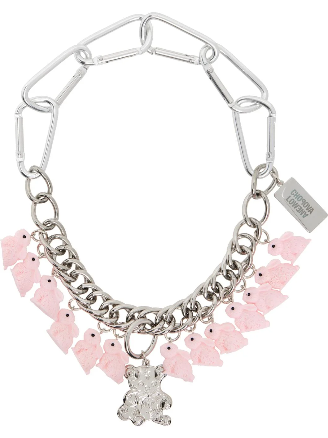 Curb chain necklace in palladium-plated brass. · Graphic charms and logo plaque at length · Stainless steel carabiner fastenings · L18" Supplier color: Pink/Silver Palladium-plated brass, stainless steel, zinc. Made in Bulgaria 252529F023000