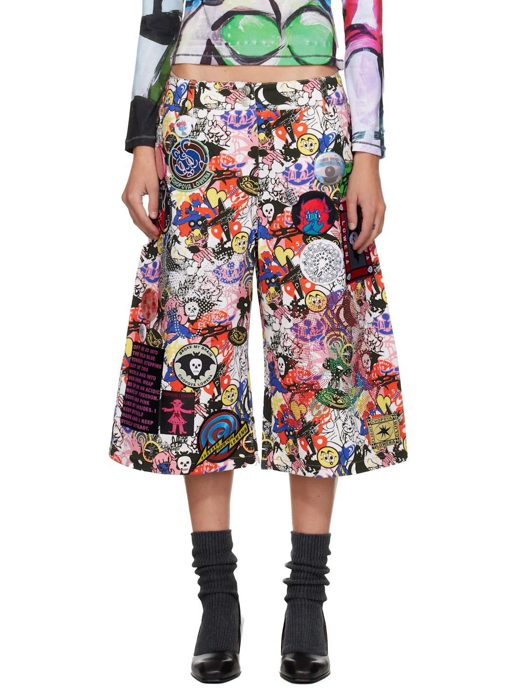 Non-stretch left-hand twill denim shorts. · Graphic pattern printed throughout · Belt loops · Four-pocket styling · Logo graphic patches and pins at front · Crystal-cut graphics at front · Logo patch at back pocket Supplier color: White multi 100% cotton. Made in Bulgaria 252529F088001