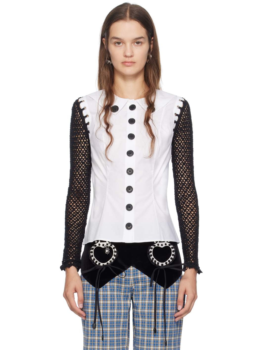 Organic cotton poplin and crocheted cotton shirt. · Button hardware and graphic appliques at sailor collar · Button closure · Eyelets at armscyes Supplier color: White Body 1: 100% organic cotton. Body 2: 100% cotton. Made in Bulgaria 242529F109004