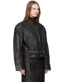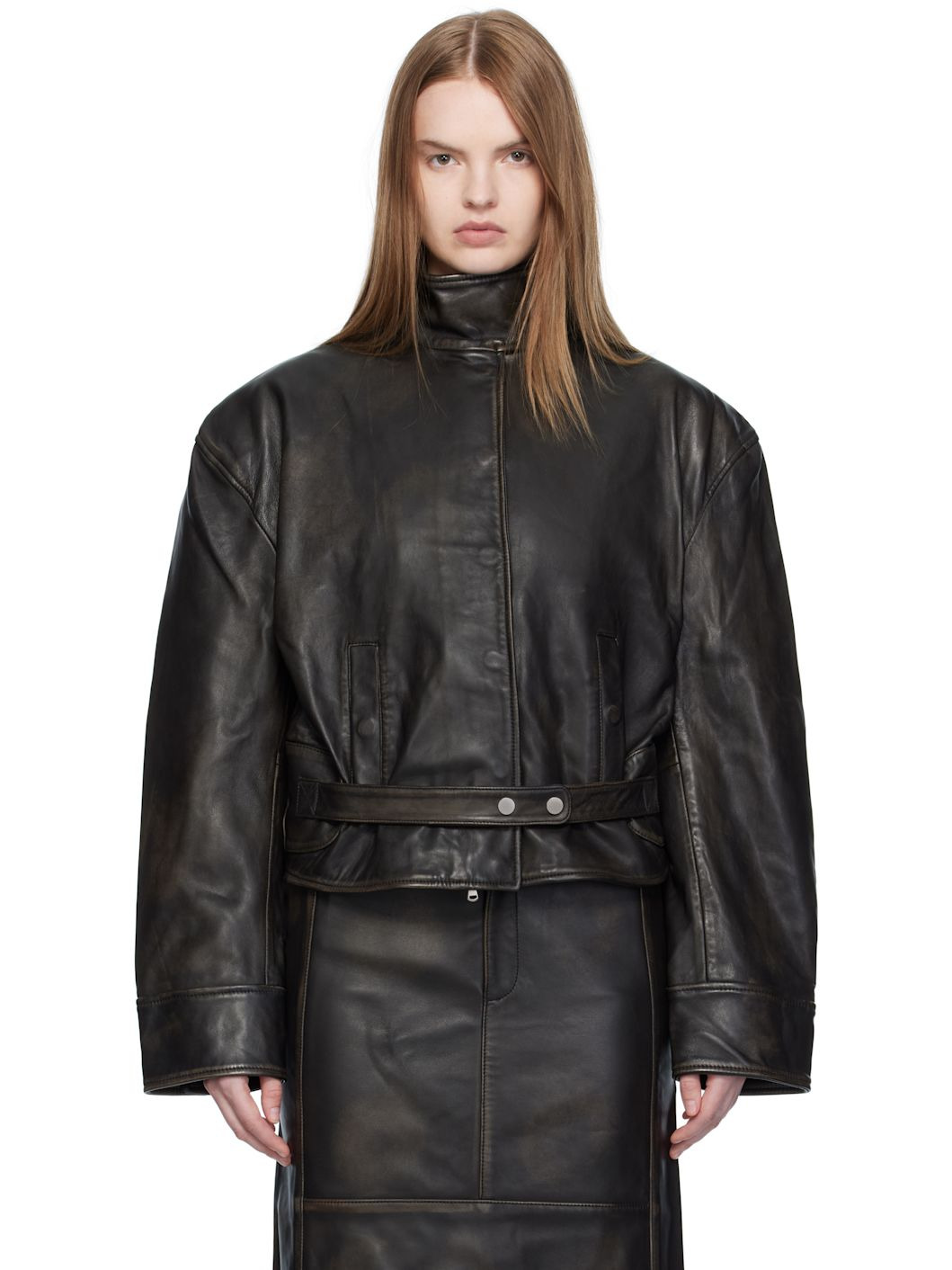 Grained lambskin jacket. · Smudging throughout · Press-stud closure at stand collar · Concealed two-way zip closure · Press-stud placket · Welt pockets and integrated press-stud straps at waist · Press-stud barrel cuffs · Welt pocket at interior · Full cupro satin twill lining Supplier color: Black Body: 100% lambskin. Lining: 100% cupro. Made in India 252311F064000