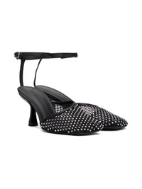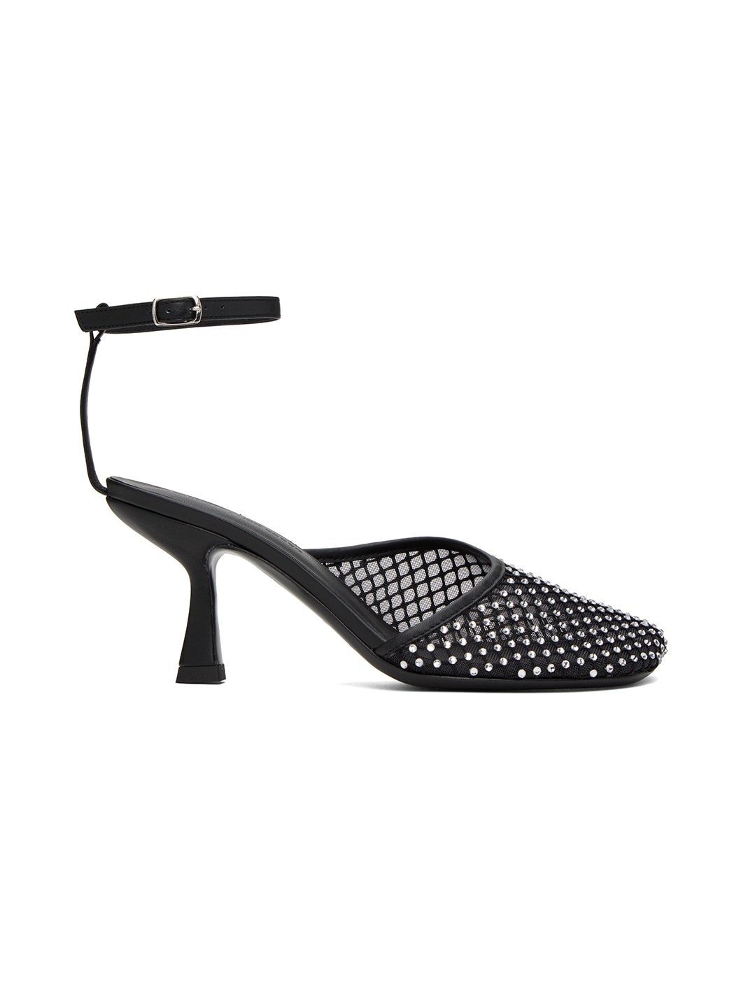 Semi-sheer stretch polyester mesh heels in black. · Crystal-cut detailing throughout · Buffed leather trim throughout · Square toe · Pin-buckle ankle strap · Logo embossed at padded leather footbed · Covered heel with rubber injection · Leather sole · Heel: H2.75" Supplier color: Nikel Upper: textile, leather. Sole: leather. Made in Italy 241311F122000