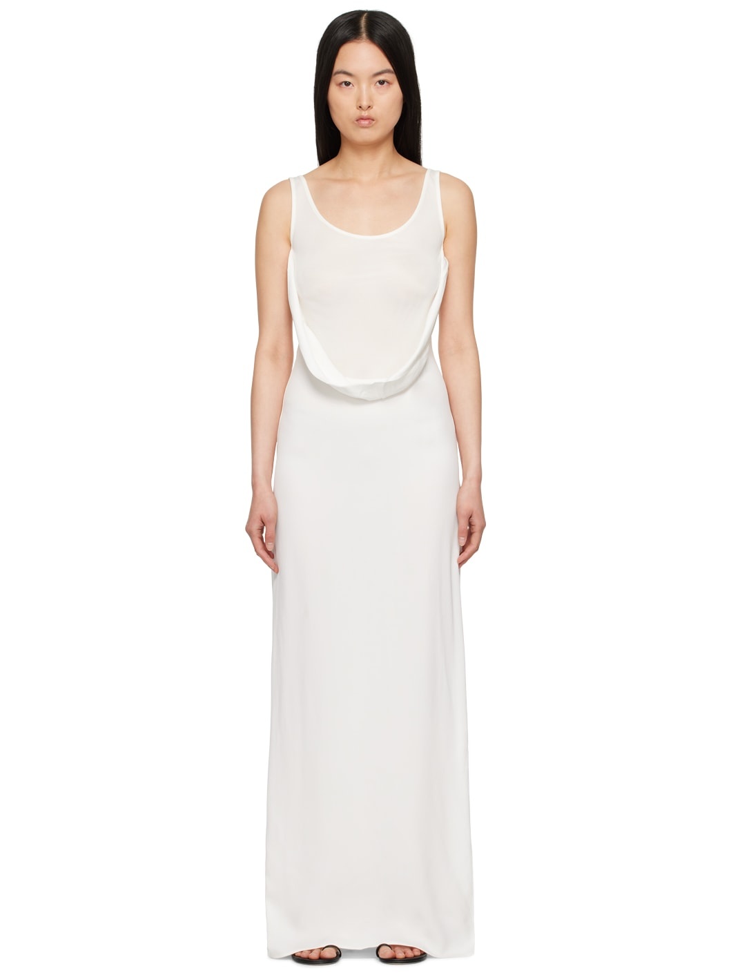 Rib knit stretch viscose crepe dress. · Paneled construction · Scoop neck · Draping at front · Vent at side seam · Unlined Supplier color: White Body 1: 97% viscose, 3% elastane. Body 2: 95% viscose, 5% elastane. Made in Viet Nam 241311F055033