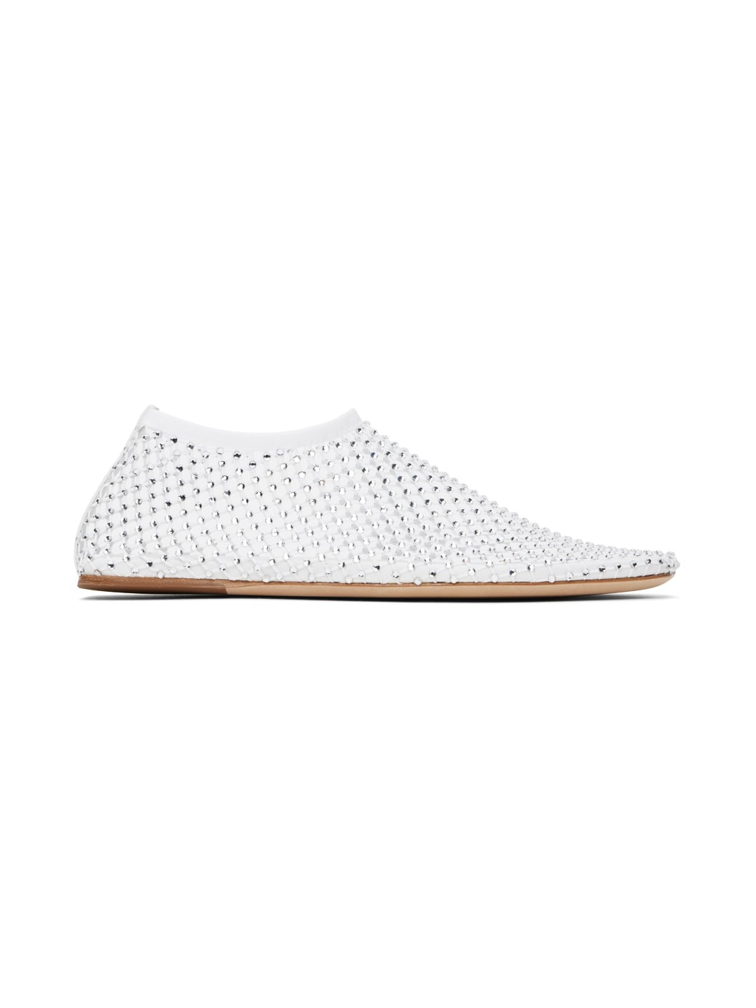 Mesh ballerina flats in white. · Crystal-cut detailing throughout · Square toe · Elasticized collar · Logo embossed at grained leather footbed · Leather sole with rubber injection Supplier color: White