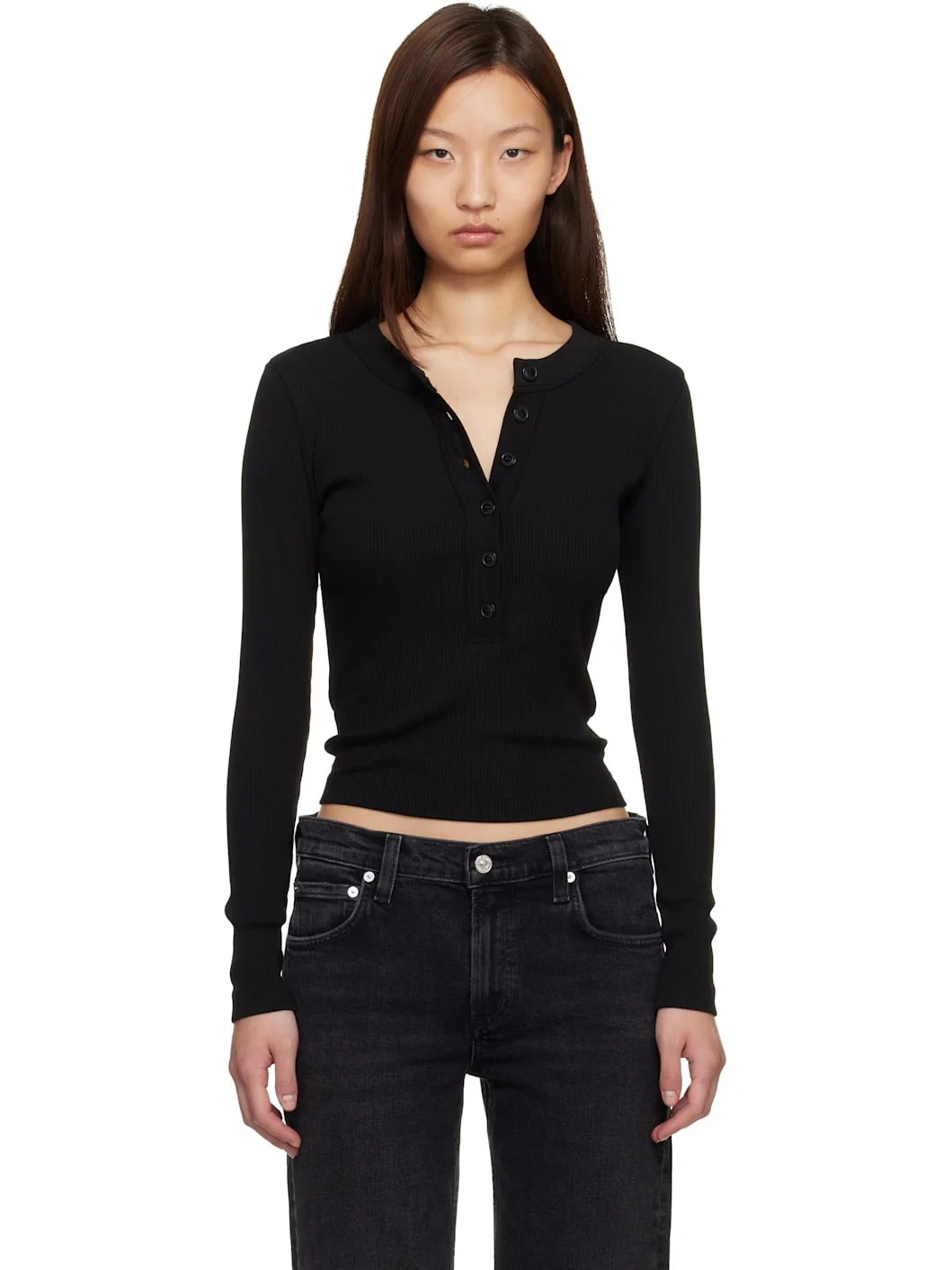 Stretch organic cotton- and lyocell-blend ribbed jersey T-shirt. · Crewneck · Six-button placket Supplier color: Black 49% organic cotton, 49% lyocell, 2% spandex. Made in United States 261030F100001