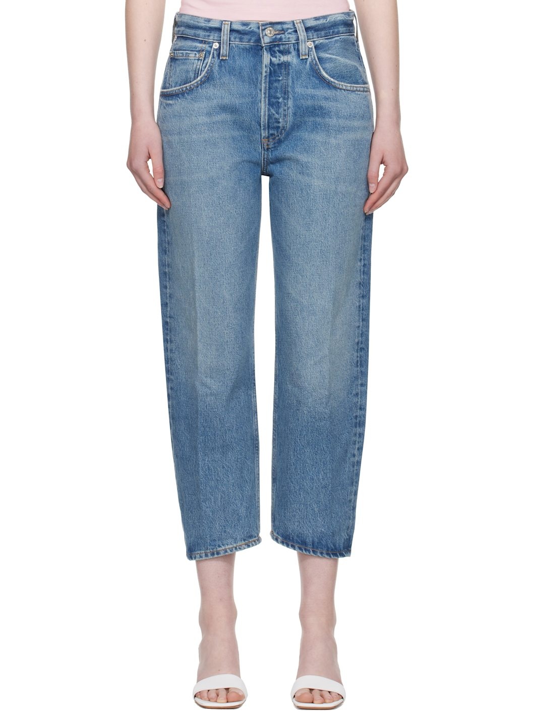Non-stretch regenerative cotton denim jeans. Fading, whiskering, and subtle distressing throughout. · Loose-fit, tapered · Belt loops · Five-pocket styling · Button fly · Logo patch at back waistband · Logo-engraved silver-tone hardware · Contrast stitching in tan Part of the HUMANITY collection. Supplier color: Pacifica 100% regenerative cotton. Made in Turkey 252030F069000