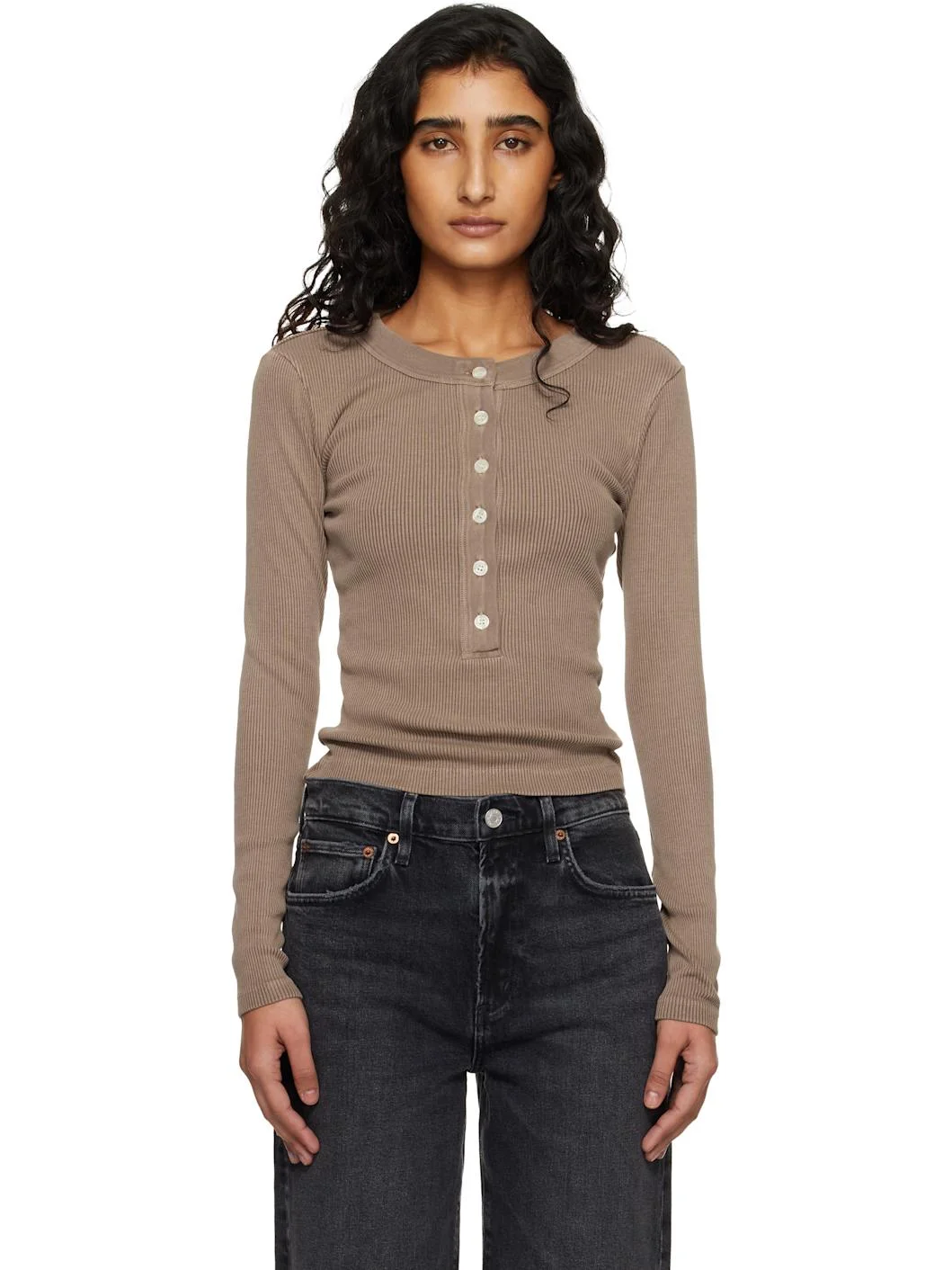 Ribbed stretch organic cotton-blend jersey henley. · Crewneck · Six-button placket Part of the HUMANITY collection. Supplier color: Cocoa 49% organic cotton, 49% lyocell, 2% spandex. Made in United States 261030F110009
