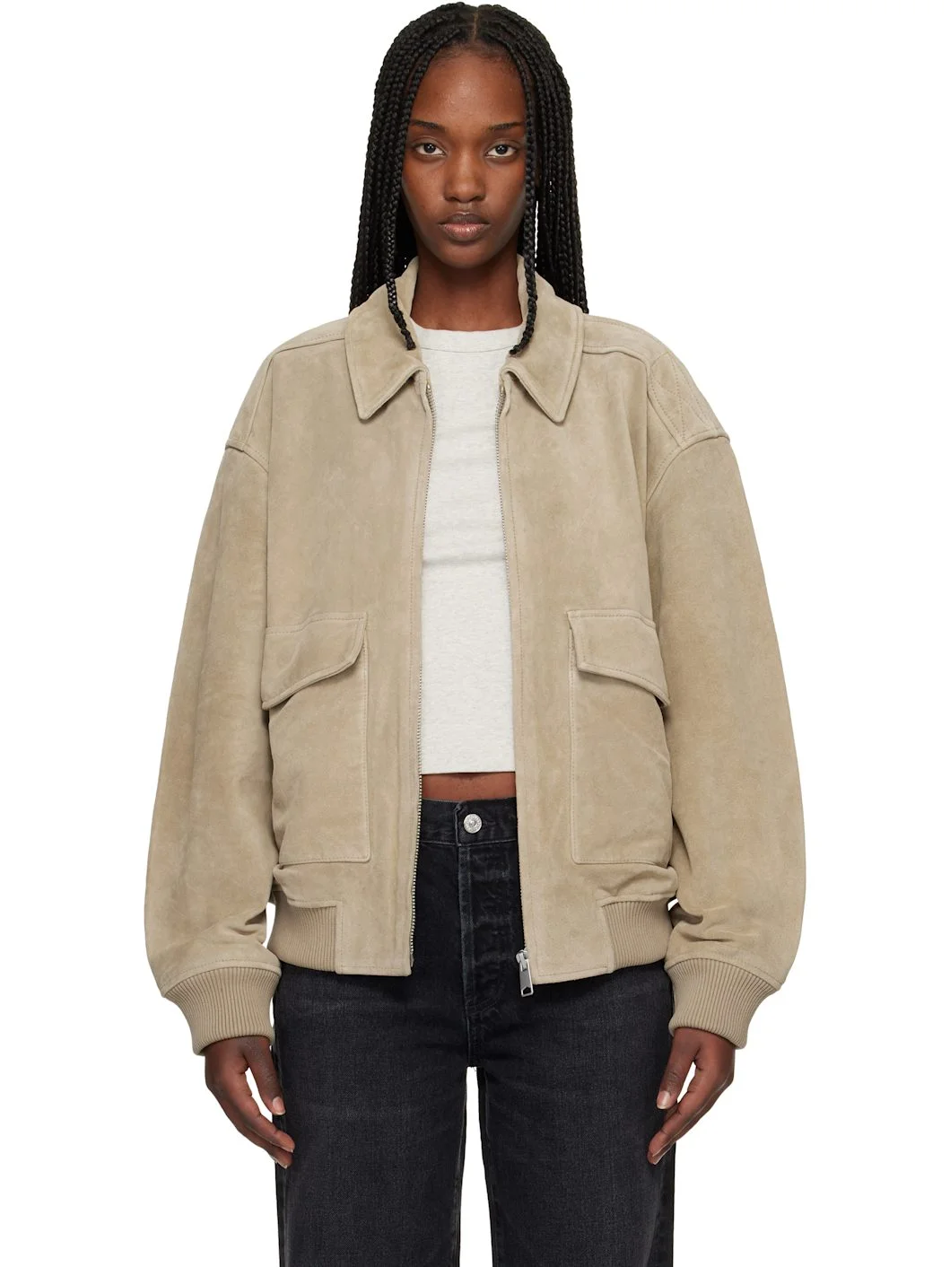 Suede jacket. · Spread collar · Two-way zip closure · Rib-knit hem and cuffs · Flap and welt pockets at waist · Dropped shoulders Part of the HUMANITY collection. Supplier color: Deep Olive 100% leather. Made in India 261030F064002
