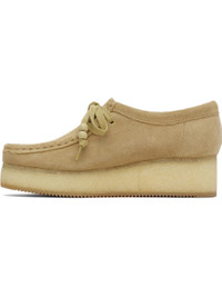 Suede derbys in beige. · Square moc toe · Beaded logo tags at lace-up closure · Bellows tongue · Suede lining · FSC®-certified crepe rubber midsole · Treaded rubber sole · Heel: H1.75" Supplier color: Maple suede Upper: leather. Sole: rubber. Made in Viet Nam 251094F120000